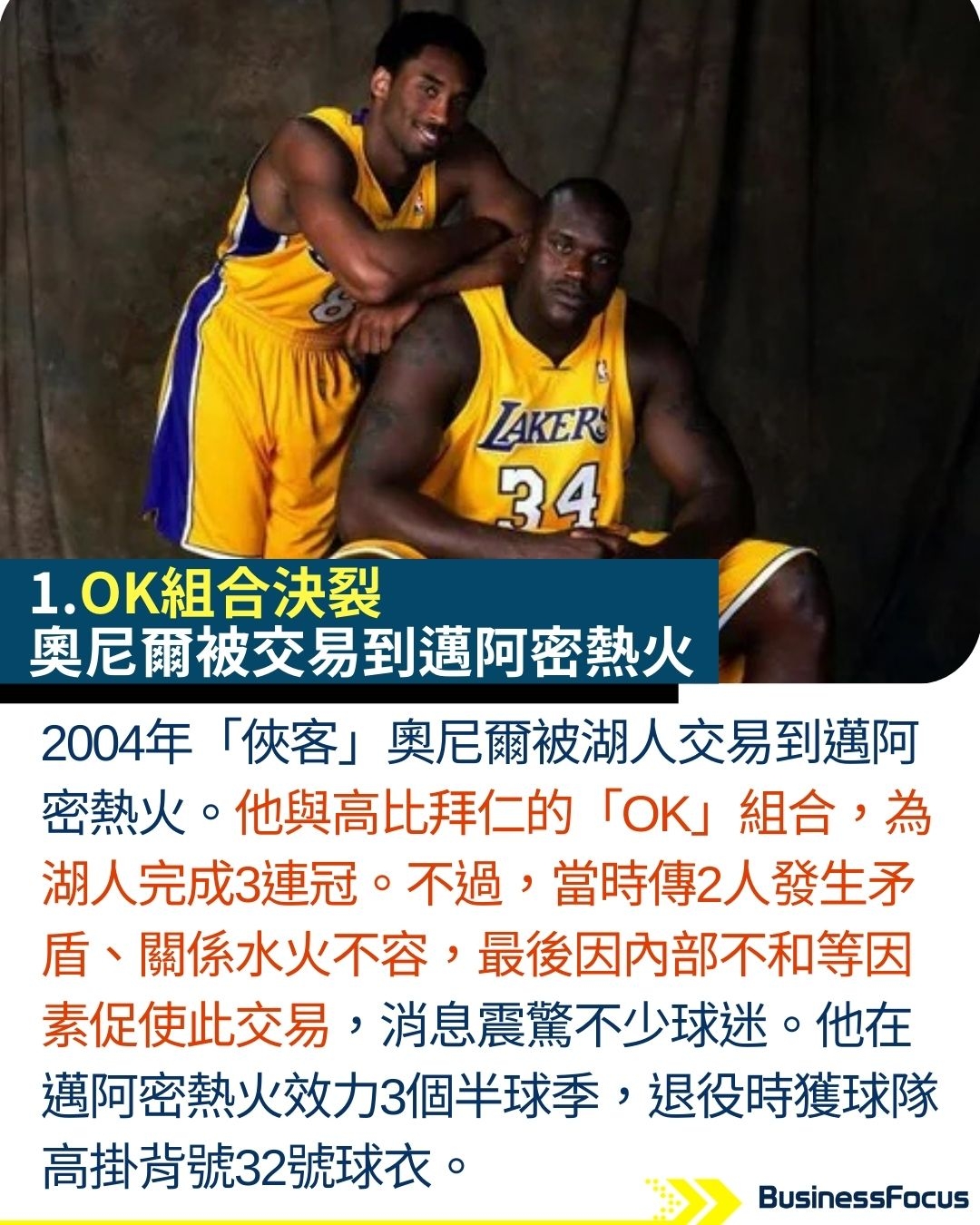 2004年7月14日,「俠客」奧尼爾(Shaquille O'Neal)被湖人交易到邁阿密熱火。他與高比拜仁的「OK」組合,可說是NBA歷史上最偉大雙人組,為湖人橫掃所有球隊,完成3連冠。不過當時傳2人發生矛盾、關係水火不容,最後因內部不和等因素促使此交易,消息震驚不少球迷。