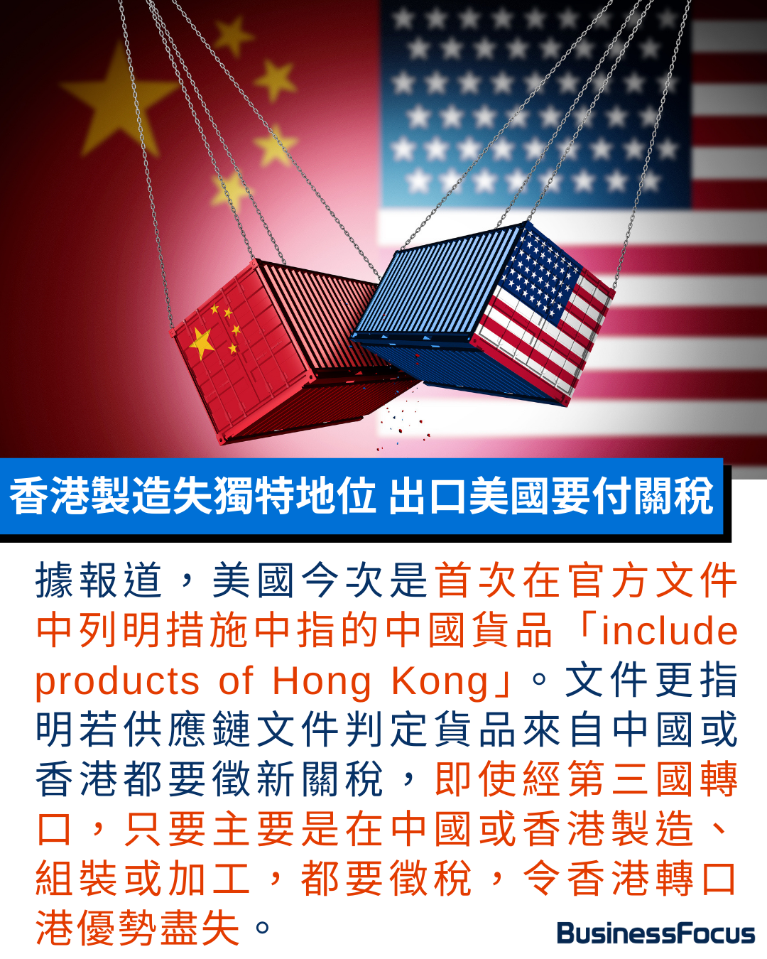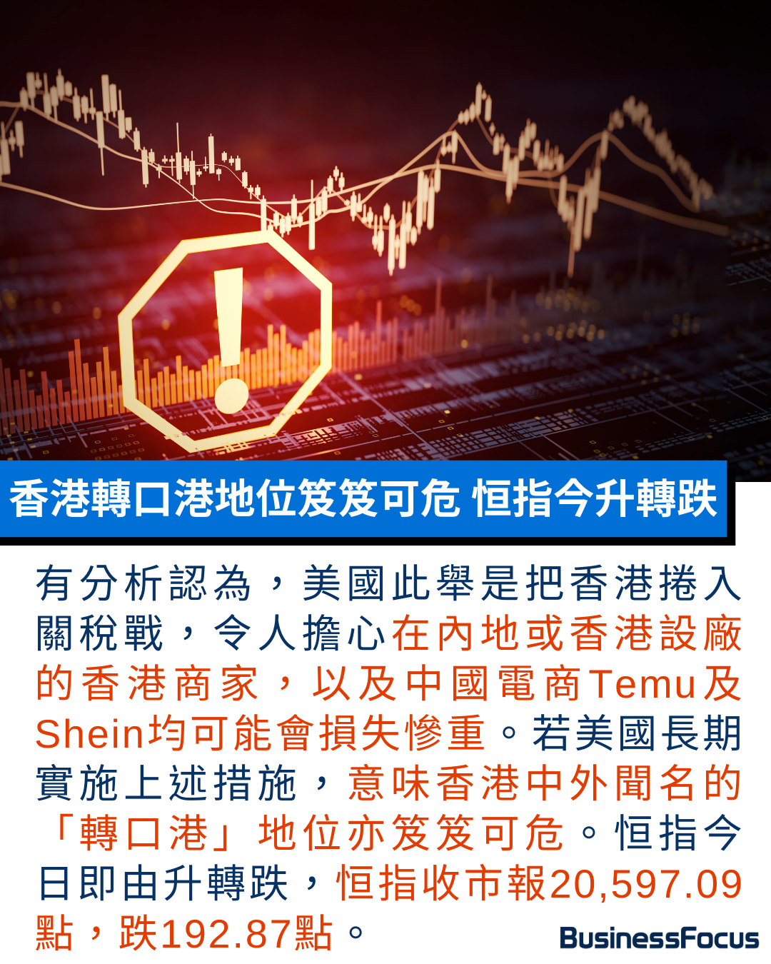 若美國長期實施上述措施,意味香港中外聞名的「轉口港」地位亦笈笈可危。恒指今日即由升轉跌,恒指收市報20,597.09點,跌192.87點。各界關注美國把香港製造產品及由內地轉口美國商品全視作「中國貨」,會否只是一項臨時措施,作為特朗普與中國進行關稅談判時的重要籌碼。