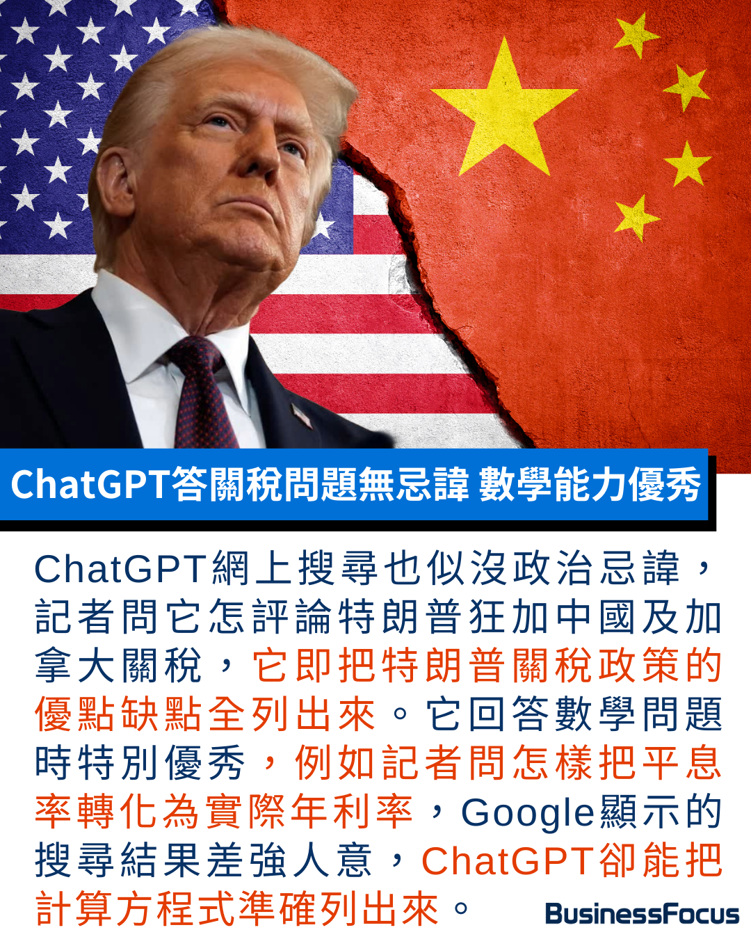 ChatGPT網上搜尋也看似沒有政治忌諱,記者問它怎樣評論特朗普狂加中國及加拿大關稅,以及有何利弊,它隨即迅速的把特朗普關稅政策的優點缺點全詳列出來。此外,它跟時事跟得「很貼」,例如記者再問他美國郵政是否停收來自中港的包裹?ChatGPT即正確無誤地指出,美國郵政的確一度有此措施,但最新消息是該措施疑取消了。