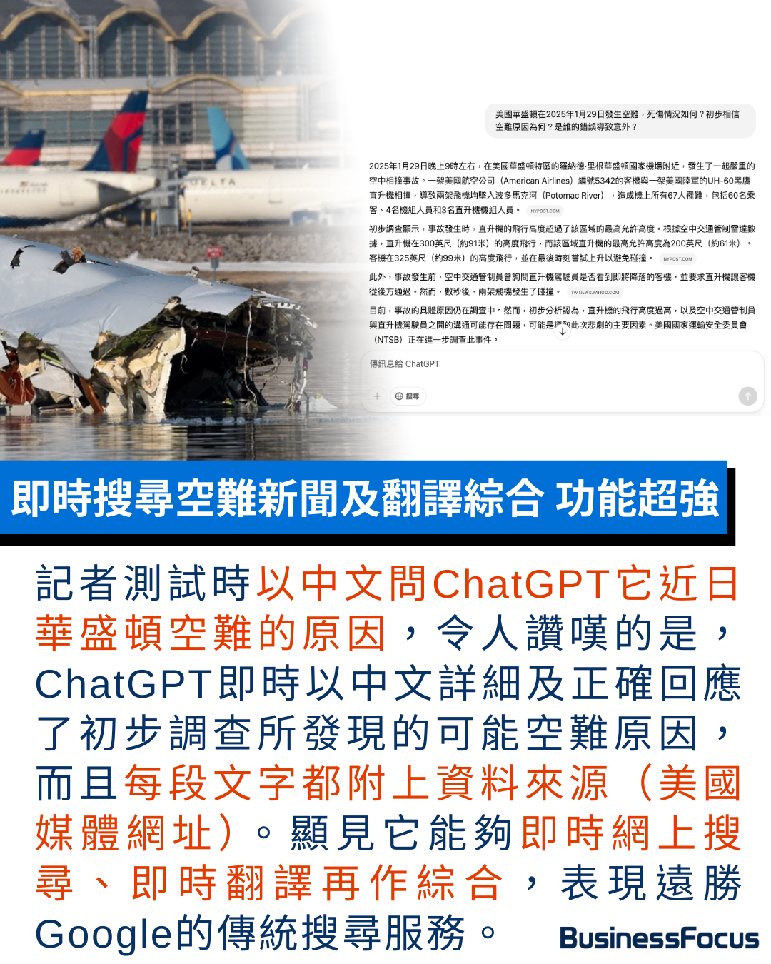 記者首先問chatGPT香港及美國的天氣資料,證實它能夠提供即時天氣訊息,意味它確有上網搜尋。記者隨即以中文問它近日華盛頓空難的原因,令人讚嘆的是,ChatGPT即時以中文詳細及正確回應了初步調查所發現的可能空難原因(直升機飛得太高、與控制塔溝通亦或有問題),而且每段文字都附上資料來源(美國媒體網址)。顯見它能夠即時網上搜尋、即時翻譯再作綜合,表現遠勝Google的傳統搜尋服務。
