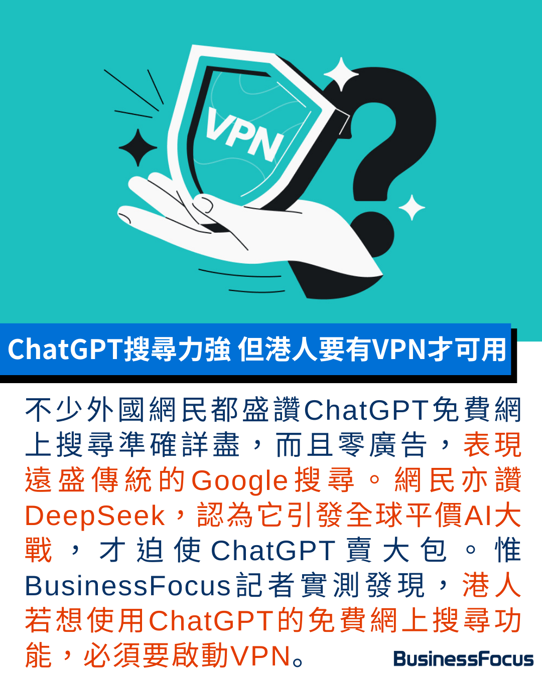 惟BusinessFocus記者實測發現,港人若想使用ChatGPT的最新免費AI網上搜尋功能,必須要先啟動VPN服務,「偽裝」自己身處歐美日台等國家,否則無法享用此新服務,因OpenAI一直拒為中港網民提供服務。而記者測試時以VPN瀏覽chatgpt.com網站,證實不用登入便可使用chatGPT搜尋服務。