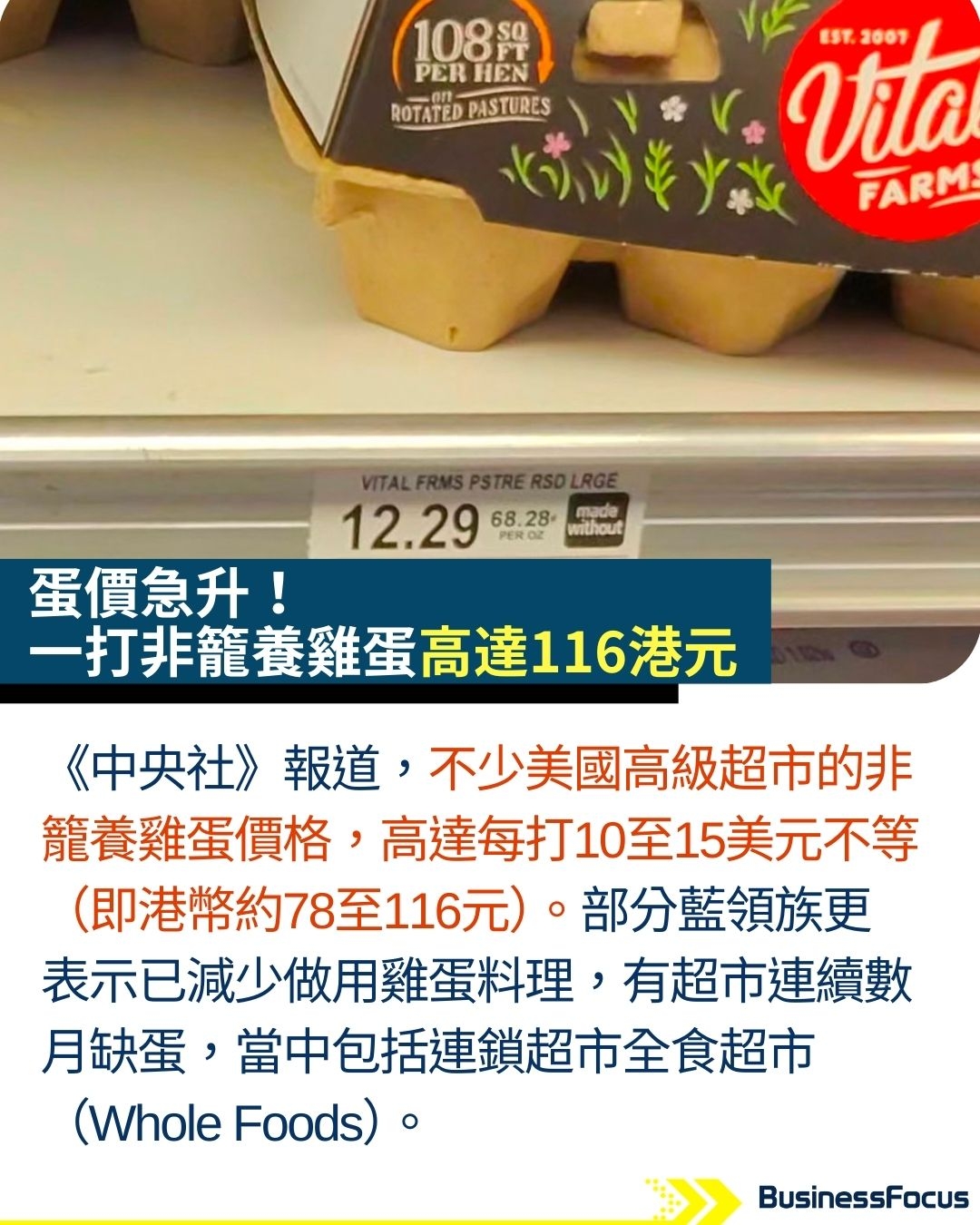 根據《Business Insider》報道,去年美國蛋價急升,由第一季至第四季升幅達58%。而12月蛋價更漲至4.15美元(即港幣約32元)。《中央社》亦指,不少美國高級超市的非籠養雞蛋價格,高達每打10至15美元不等(即港幣約78至116元)。而部分藍領族更表示已減少做用雞蛋料理。網絡上更出現不少有關雞蛋的資訊,部分超市連續數月缺蛋,當中包括連鎖超市全食超市(Whole Foods)。有網民上載該超市貨架相片,其中的公告寫上「在採購符合標準雞蛋方面遇上困難」。