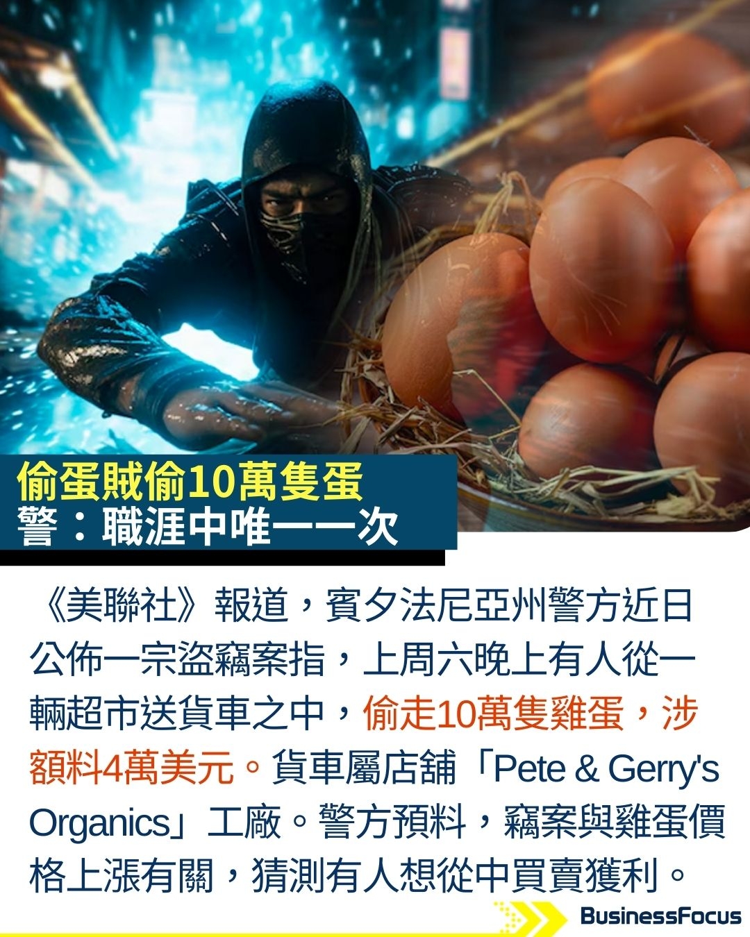 綜合美媒報道,由於禽流感疫情持續,雞蛋供應量大幅下降,多地出現蛋荒。據美國農業部數據,近月受感染鳥類數量急增,去年12月達1,800萬,上月更迫近2,300萬。而雞蛋短缺情況之下,雞蛋成為當地「奢侈品」,更有人疑打起主意從中謀利,成為「偷蛋賊」。《美聯社》報道,賓夕法尼亞州警方近日公佈一宗盜竊案指,在上周六(1日)晚上,有人從一輛超市送貨車,偷走10萬隻雞蛋,涉額料4萬美元(即港幣約31萬元)。當地警方表示,貨車屬格林卡斯爾(Greencastle)一間店舖「Pete & Gerry's Organics」所經營的工廠。