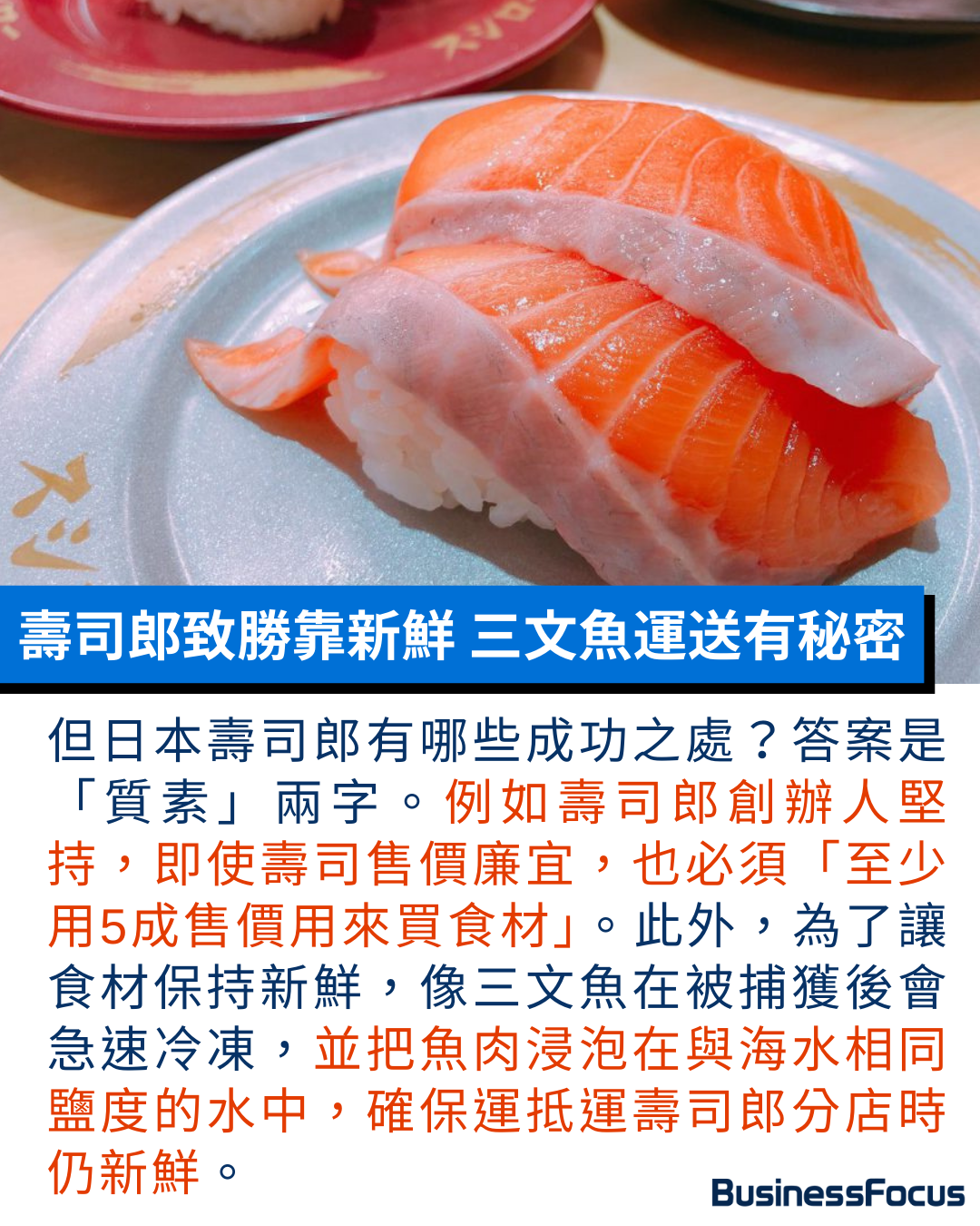 例如壽司郎創辦人堅持,即使壽司售價廉宜,也必須「至少用5成售價用來買食材」,以確保壽司質素。而為了讓食材保持新鮮,壽司郎更研發出一套特別的保鮮技巧,以三文魚為例,三文魚捕獲後會急速冷凍,並將魚肉浸泡在與海水相同鹽度的水中,故即使從工廠遠道把魚肉運送至不同店舖,仍不易變質,藉此保持新鮮與口感。