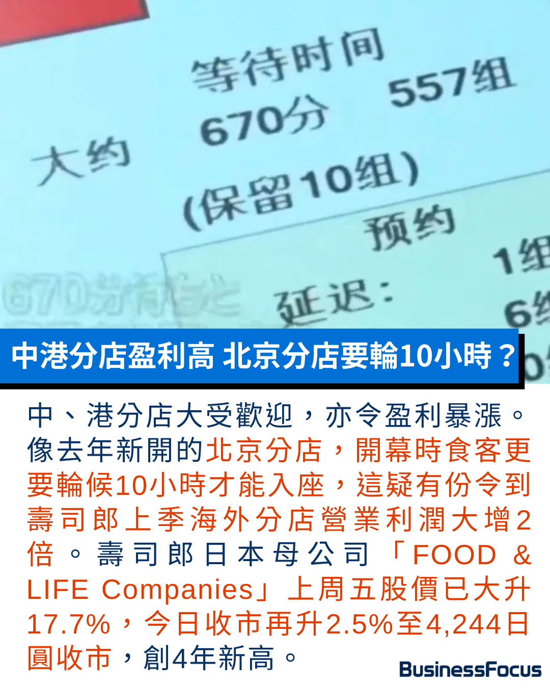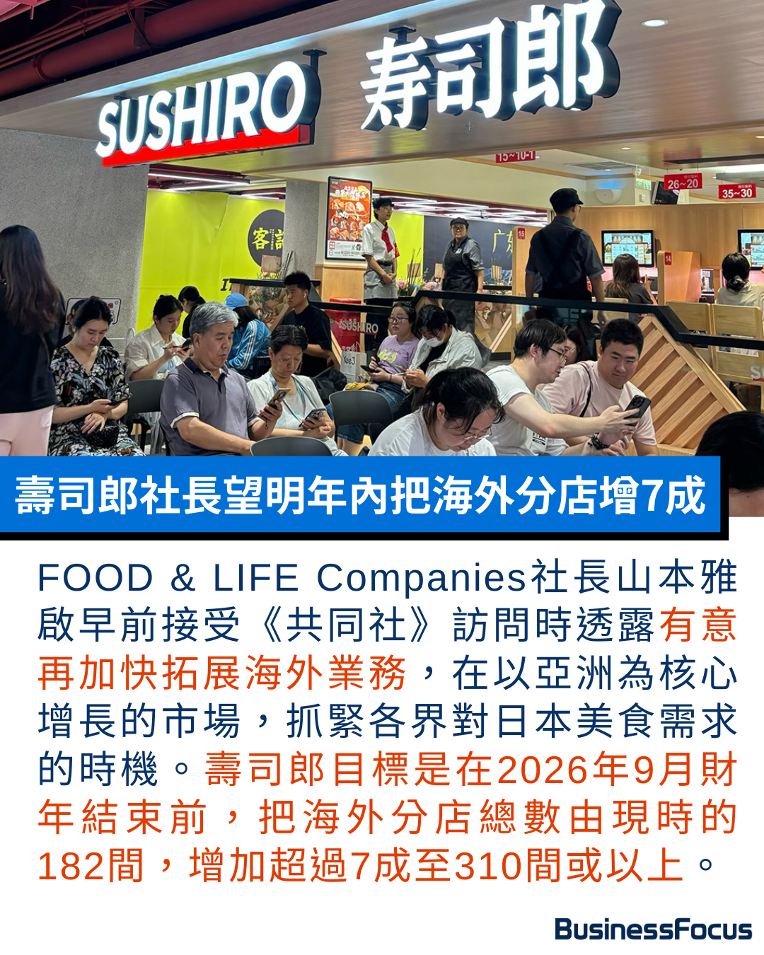 山本雅啟透露集團在台灣和香港的業務保持良好增長,又承認中國市場是增長的關鍵。雖然福島核污水排海一度令日本食品形象受損和經濟增速放緩,亦對中國業務造成打擊,但隨著中國沿海城市需求旺盛,帶動集團業績反彈。據網上資料,壽司郎現時在內地分店已增至近50間。