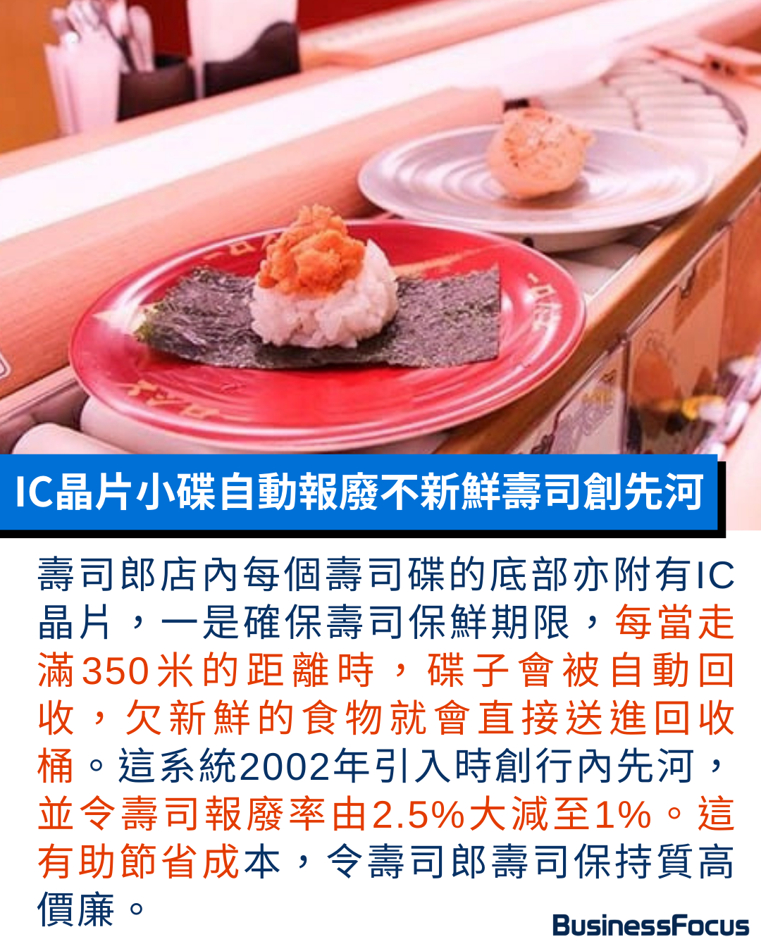 這套 「迴轉壽司綜合管理系統」在2002年引入,創行內先河,據悉,引入系統前店舖的壽司報廢率平均高達2.5%,其後卻大幅降低至1%,即100碟壽司中只有1碟會被扔棄,極低報廢率有助壽司郎節省成本,並在一眾同行中脫穎而出。這是壽司郎壽司能夠既保高質,又保廉價的關鍵,遂在同業的競爭中勝出。