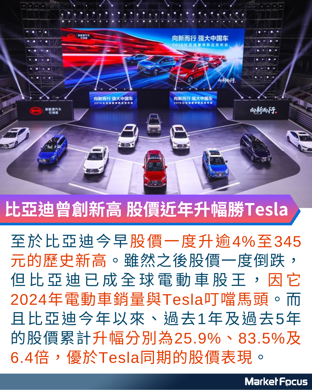 至於比亞迪今早在DeepSeek的AI概念加持之下,股價一度升逾4%至345元的歷史新高,但之後走勢反覆兼曾經倒跌,至正午收市報332.4元,微升0.7%。不過比亞迪已成全球電動車股王,除了是因為它2024年電動車銷量與Tesla(TSLA)叮噹馬頭之外,比亞迪於「今年以來、過去1年及過去5年」的股價累計升幅(截至昨日)分別為25.9%、83.5%及6.4倍,同優於Tesla同期的股價表現(跌13.2%、升81.2%及升5.8倍)。