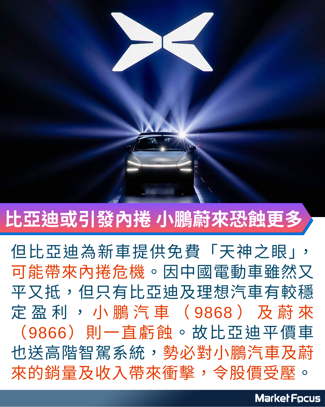 但有評論指出,比亞迪的「AI免費智駕系統大放送」,可能帶來內捲危機。因現時中國電動車雖然「又平又抵」,但只有比亞迪及理想汽車有較穩定盈利,小鵬汽車(9868)及蔚來(9866)則一直陷於虧蝕。故比亞迪平價車也送高階智駕系統「天神之眼」,勢必對小鵬汽車及蔚來的銷量及收入帶來巨大壓力。