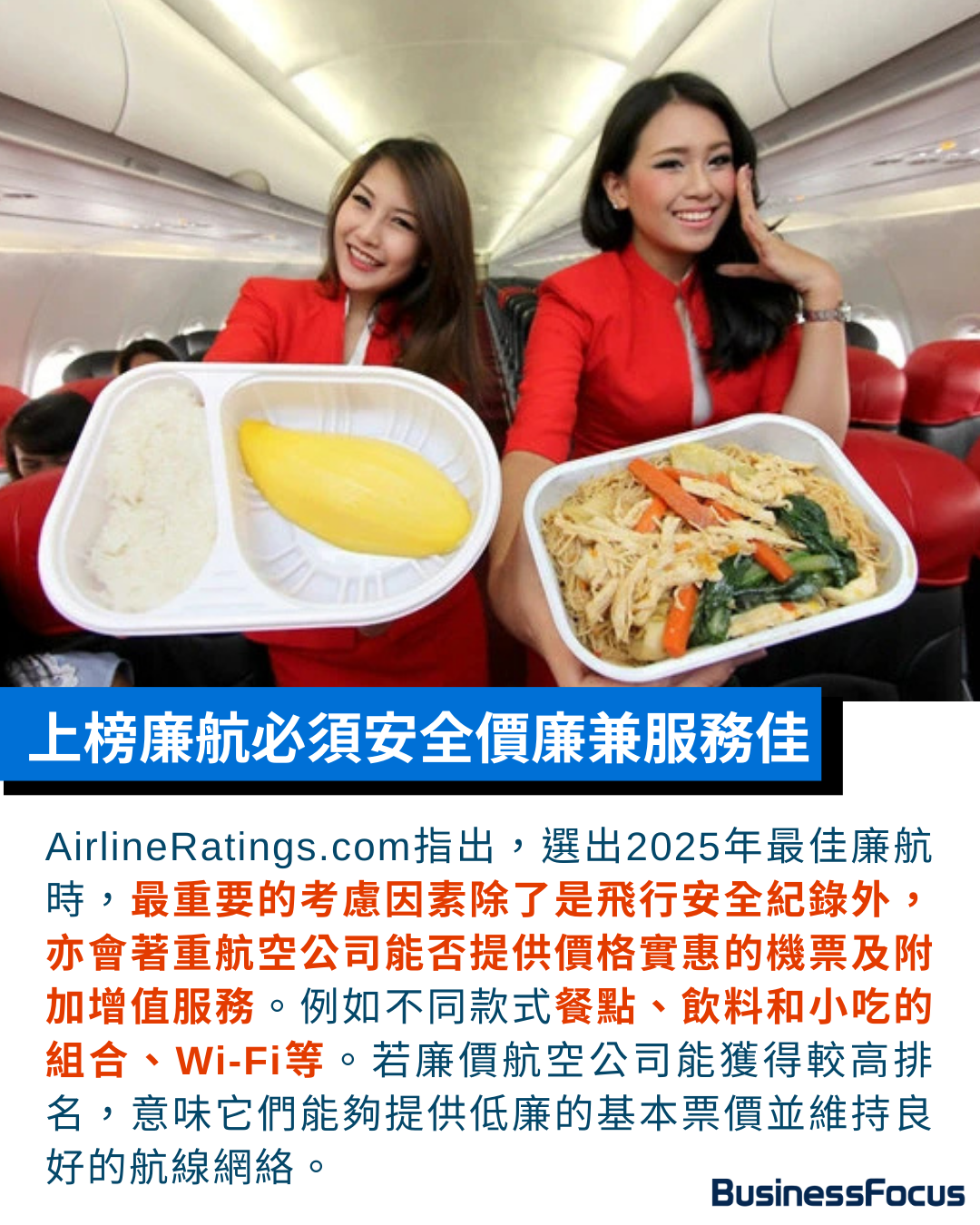 AirlineRatings.com指出,在選出2025年排名最高旳20間的低成本航空公司(廉航)時,它考慮的除了是飛行安全因素,亦會著重航空公司能否提供價格實惠的機票及附加增值服務,例如餐點、飲料和小吃的組合、Wi-Fi和機上娛樂等。
