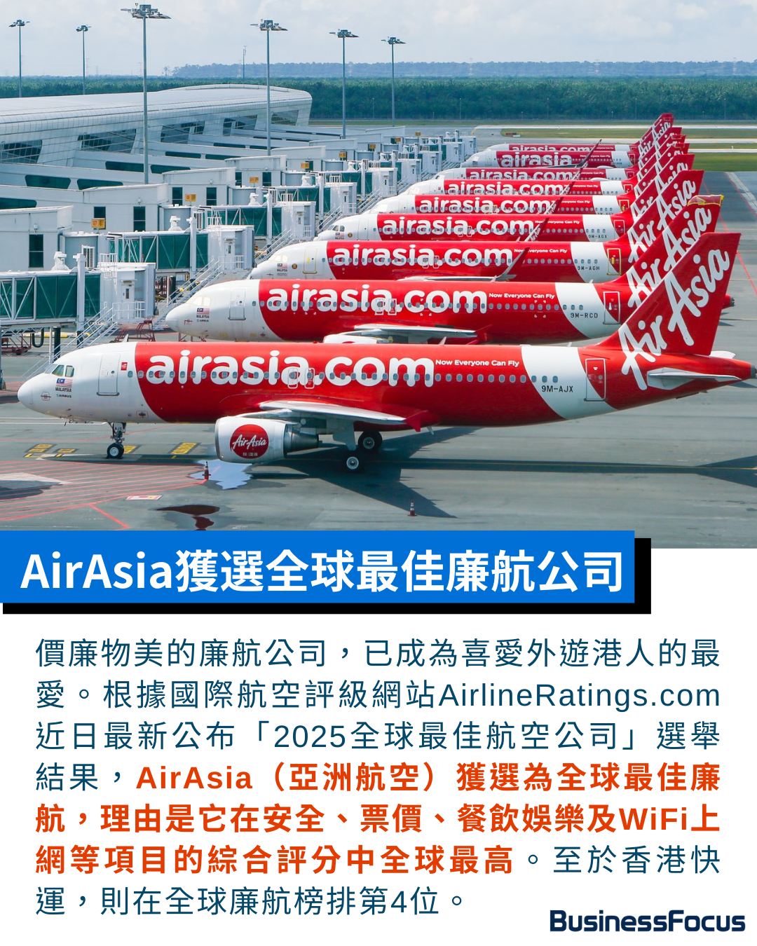 價廉物美的廉航公司,已成為喜愛外遊港人的最愛。根據國際航空評級網站AirlineRatings.com近日最新公布「2025全球最佳航空公司」(World's Best Airlines For 2025)選舉結果,AirAsia(亞洲航空)獲選為全球最佳廉航,理由是它在安全、票價、餐飲娛樂及WiFi上網等項目的綜合評分中全球最高。至於香港快運(HK Express),則在全球廉航排行榜之中名列第4位。