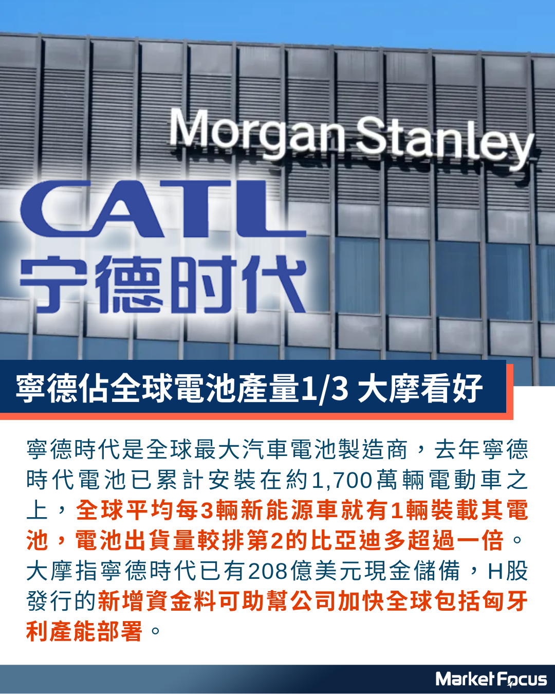 大摩早前曾發表報告,指寧德時代已有208億美元現金儲備,H股發行的新增資金將可助公司加快全球產能部署。寧德時代近年已宣布匈牙利建廠,亦宣布與Stellantis 在西班牙合建總投資額42億美元、產能50GWh的工廠。考慮到歐盟地區正淘汰燃油車,大摩看好寧德時代有能力增加更多訂單。