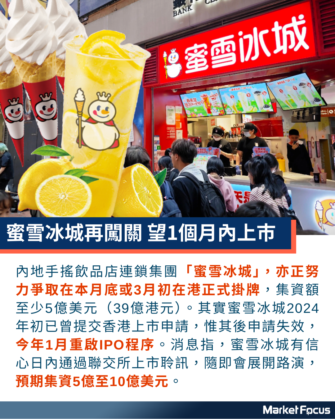 至於內地手搖飲品店連鎖集團「蜜雪冰城」,亦正努力爭取在本月底或3月初在港正式掛牌,集資額5億美元(39億港元)。其實蜜雪冰城2024年初已曾提交香港上市申請,惟其後申請失效,今年1月重啟IPO程序。消息指,蜜雪冰城有信心日內通過聯交所上市聆訊,隨即會展開路演,預期集資5億至10億美元(39億至78億港元)。