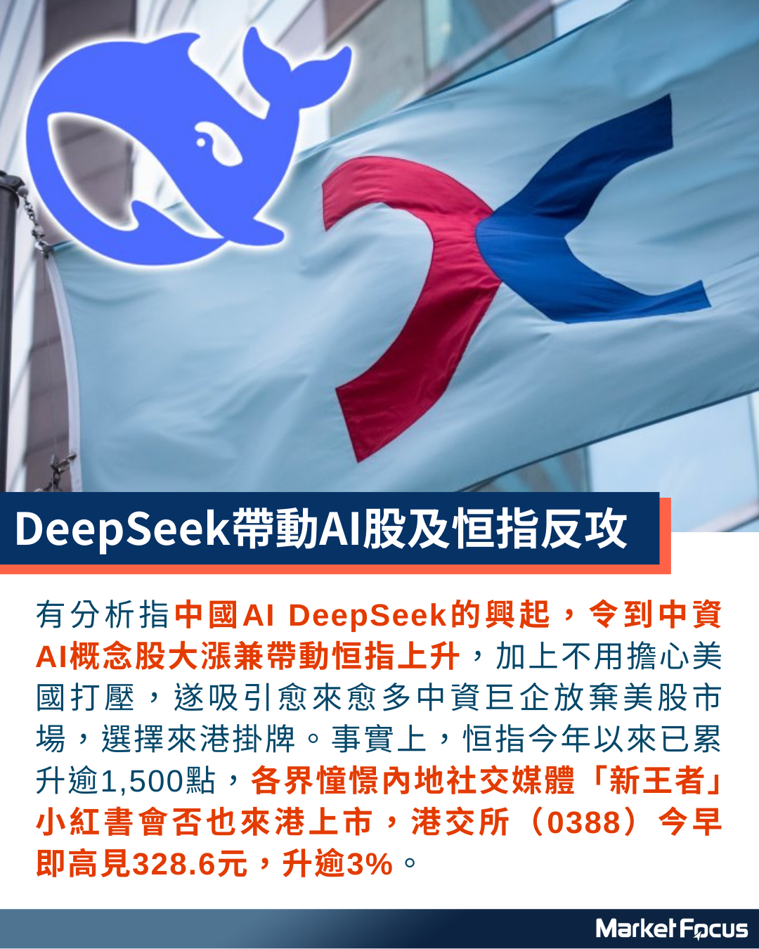 有分析認為,中國AI DeepSeek的興起,令到中資AI概念股大漲帶動恒指上升,加上不用擔心美國打壓,遂吸引愈來愈多中資巨企放棄美股市場,選擇來港掛牌。事實上,恒指今年以來已累升逾1,500點,各界關注能否衝破2.2萬點的重要心理關口,並憧憬內地社交媒體「新王者」小紅書也會來港上市帶旺港股。港交所(0388)今早即高見328.6元,升逾3%。