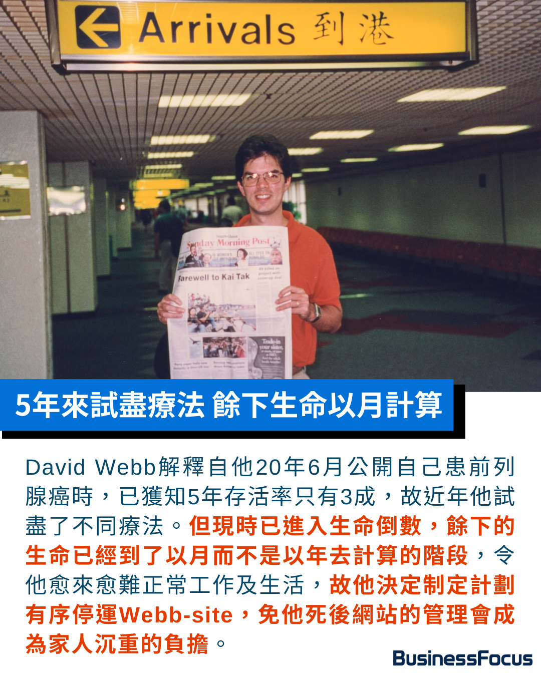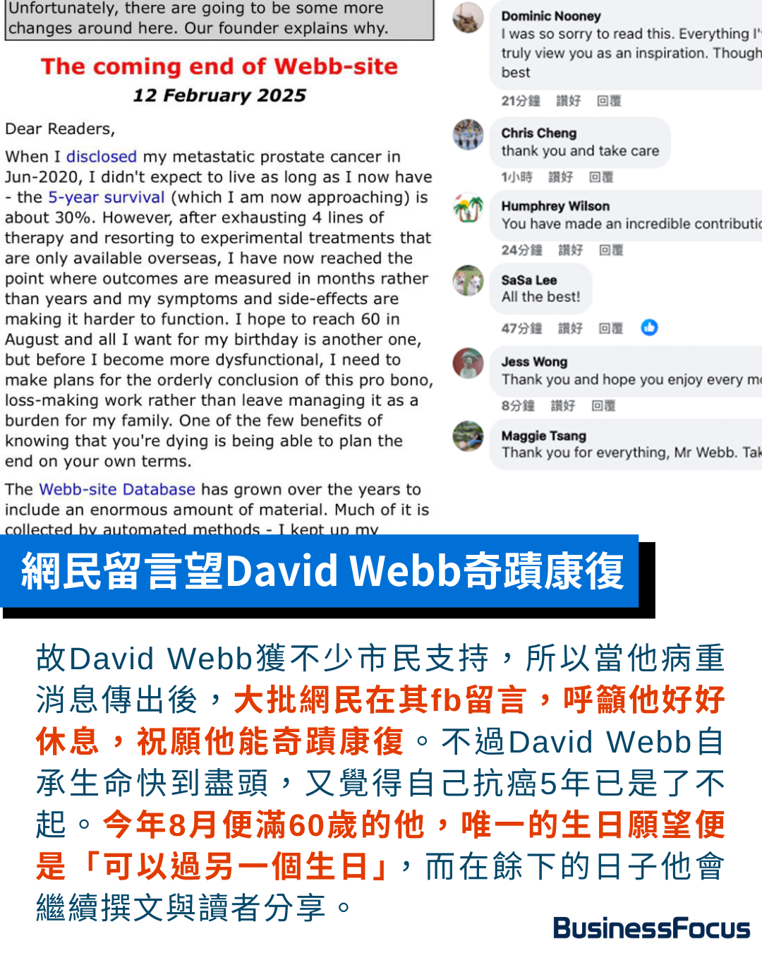 不過David Webb在發給廣大讀者的公開信中自承,生命已快到盡頭,又覺得自己能抗癌5年已是了不起。今年8月便滿60歲的他,屆時唯一的生日願望,便是「可以過另一個生日」。他解釋自他2020年6月公開自己患有擴散中的前列腺癌時,已獲知5年存活率只有3成,故他近年試盡了4線不同的癌症療法,包括要到海外才能接受的試驗性治療。但上天往往難從人願,故他現時已進入生命倒數,餘下的生命已經到了以月而不是以年去計算的階段。