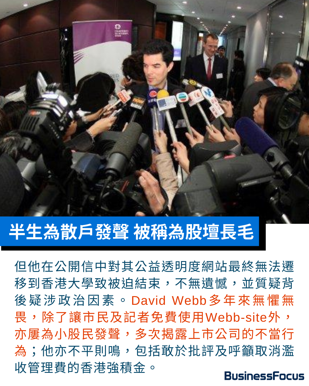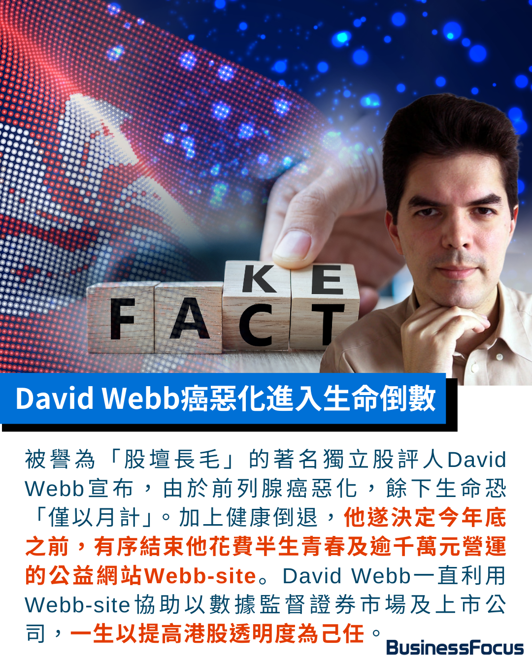 被譽為「股壇長毛」的著名獨立股評人David Webb宣布,由於前列腺癌惡化,餘下生命恐「僅以月計」。加上健康倒退,他遂決定今年底之前,有序結束他花費半生青春及逾千萬元營運的公益網站Webb-site。David Webb一直利用Webb-site協助以數據監督證券市場及上市公司,一生以提高港股透明度為己任。但他在公開信中對其公益透明度網站最終無法遷移到香港大學致被迫結束,不無遺憾,並質疑背後疑涉政治因素。