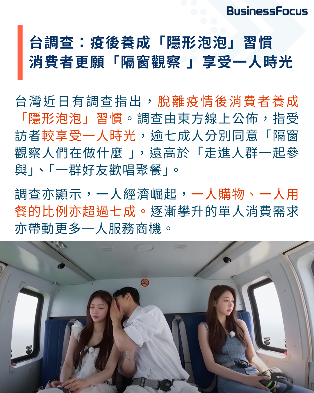 至於台灣,近日亦有調查指出,脫離疫情後消費者養成「隱形泡泡」習慣。調查由東方線上公佈,受訪者較享受一人時光,逾七成人分別同意「隔窗觀察人們在做什麼 」以及「一個人享受靜寂時空」,遠高於「走進人群一起參與」、「一群好友歡唱聚餐」。調查亦顯示,一人經濟崛起,一人購物、一人用餐的比例亦超過七成。逐漸攀升的單人消費需求亦帶動更多一人服務商機。