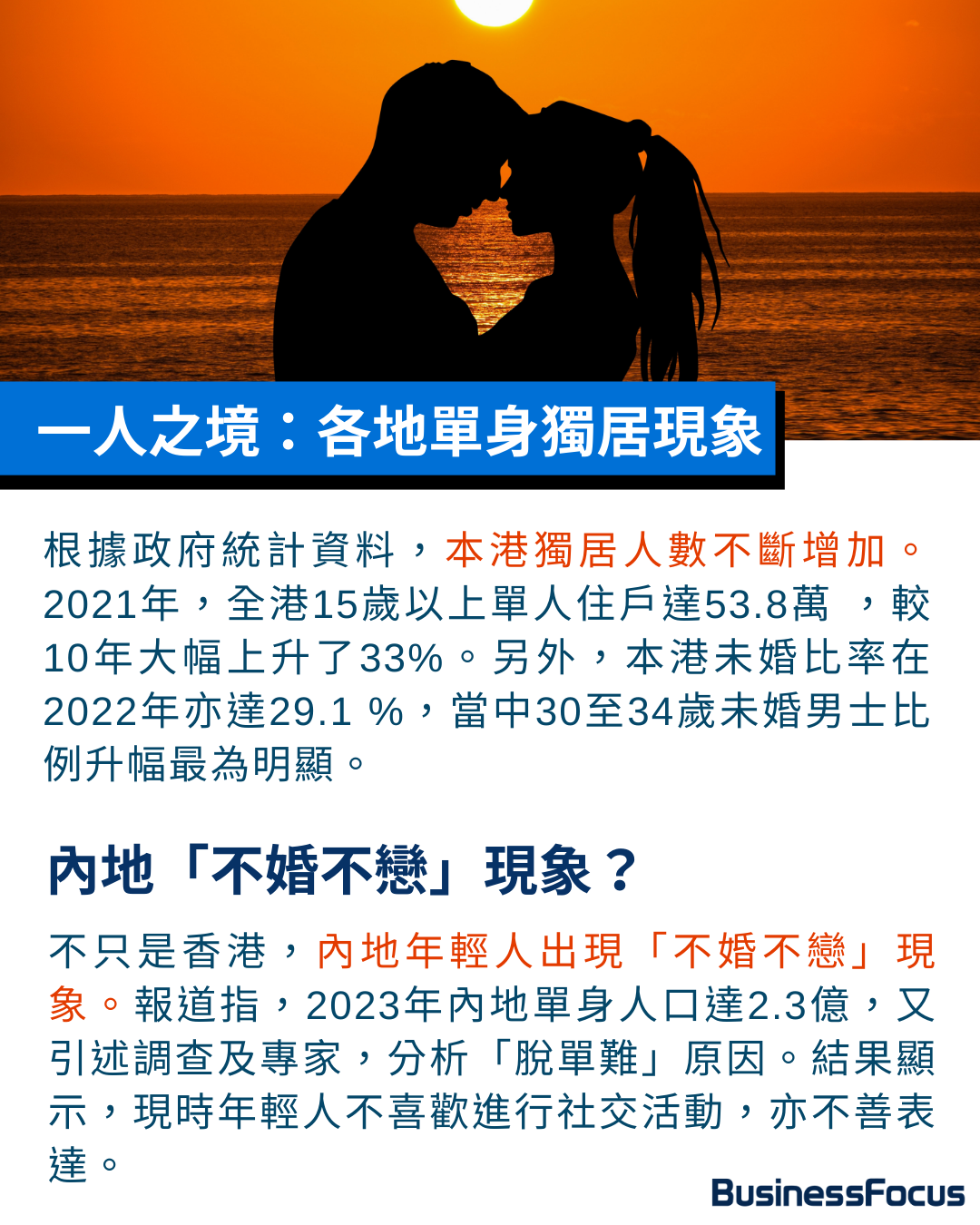 根據政府統計資料,本港獨居人數不斷增加。2021年,全港15歲以上單人住戶達53.8萬 ,較10年大幅上升了33%。另外,本港未婚比率在2022年亦達29.1 %,當中30至34歲未婚男士比例升幅最為明顯。
