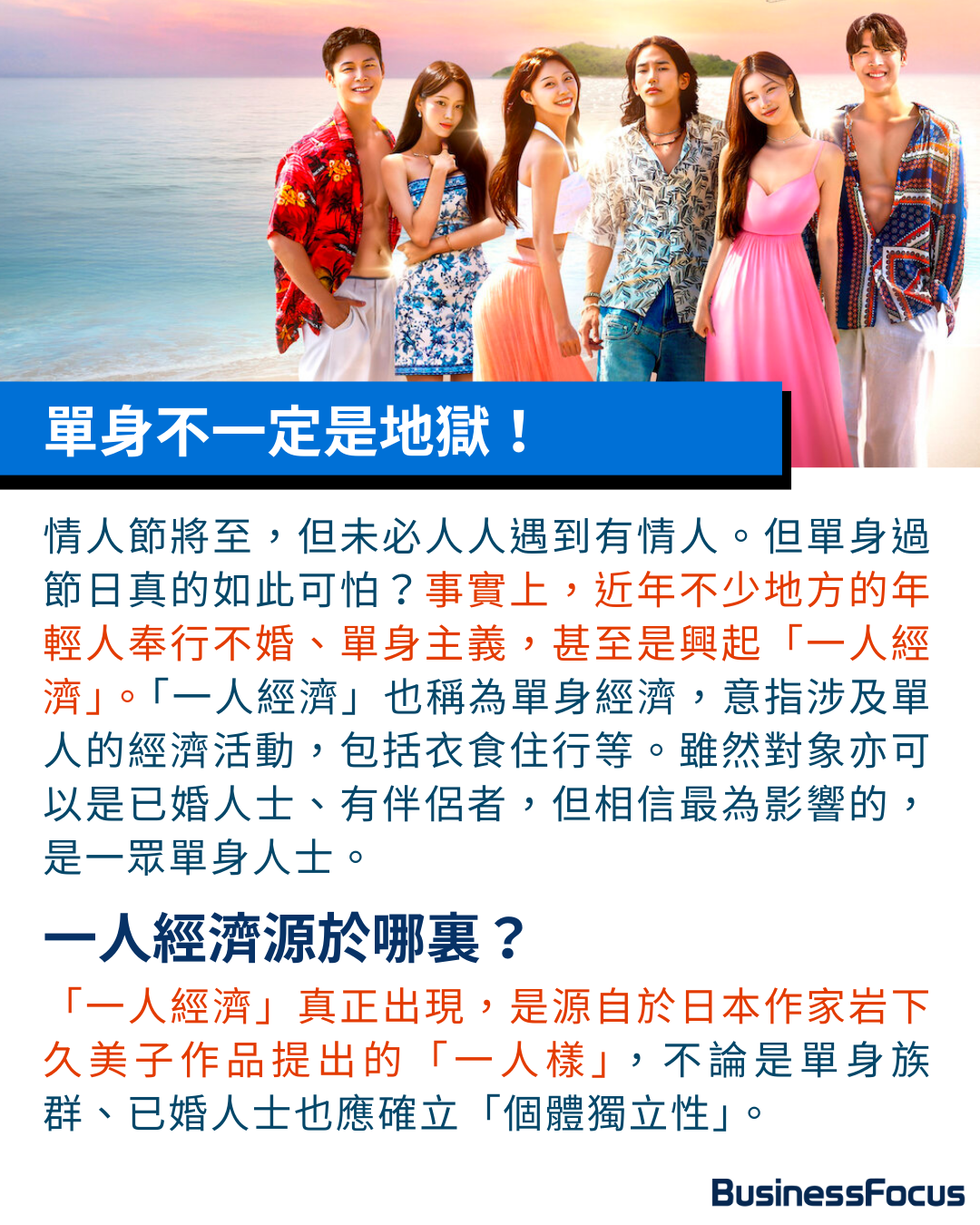 情人節將至,但未必人人遇到有情人。但單身過節日真的如此可怕?事實上,近年不少地方的年輕人奉行不婚、單身主義,甚至是興起「一人經濟」。「一人經濟」也稱為單身經濟,意指涉及單人的經濟活動,包括衣食住行等。雖然對象亦可以是已婚人士、有伴侶者,但相信最為影響的,是一眾單身人士。