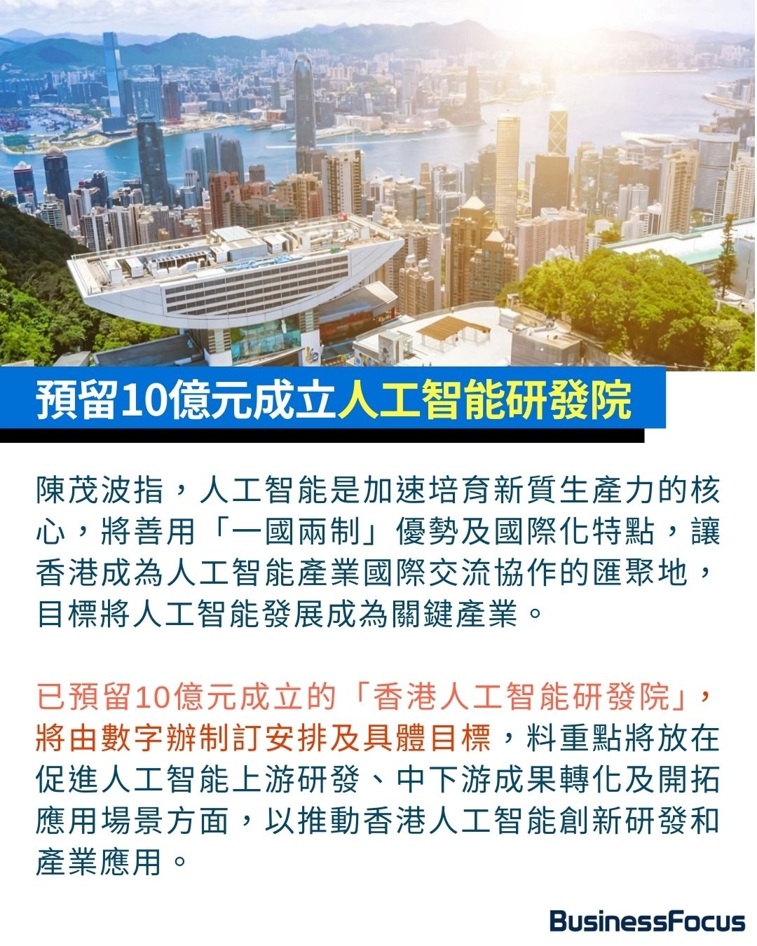 陳茂波在宣讀預算案時指,人工智能是加速培育新質生產力的核心,將善用「一國兩制」優勢及國際化特點,讓香港成為人工智能產業國際交流協作的匯聚地,目標將人工智能發展成為關鍵產業。