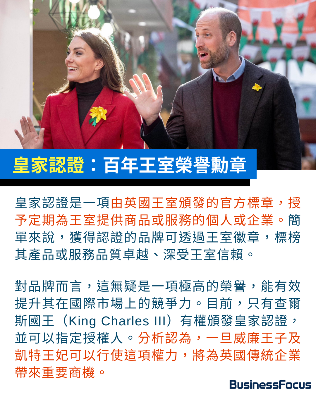 根據官方資料,該項認證有效期長達5年,品牌可每5年延續一次,當中有品牌已持有認證超過100年。對品牌而言,這無疑是一項極高的榮譽,能有效提升其在國際市場上的競爭力。目前,只有查爾斯國王(King Charles III)有權頒發皇家認證,並可以指定授權人。有分析認為,一旦威廉王子及凱特王妃可以行使這項權力,將為英國傳統企業帶來重要商機。