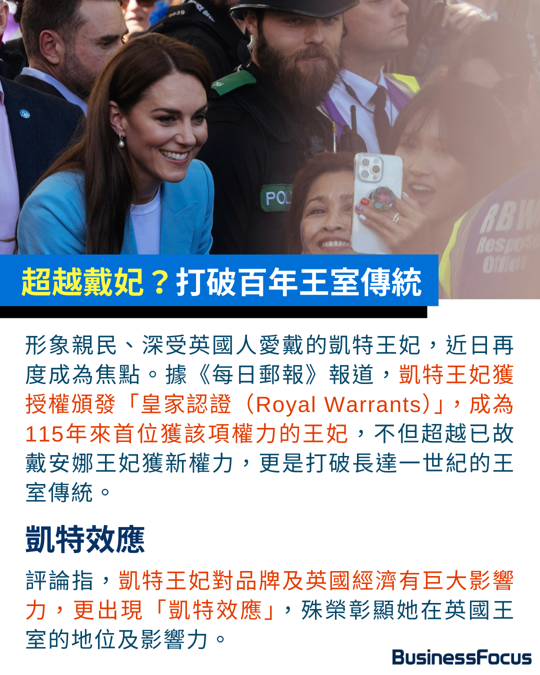 英國王室的一舉一動,一直在全球備受矚目。而當中形象親民、深受英國人愛戴的凱特王妃,近日再度成為焦點。據《每日郵報》報道,凱特王妃獲權頒發「皇家認證(Royal Warrants)」,成為115年來首位獲該項權力的王妃,不但超越已故戴安娜王妃獲新權力,更是打破長達一世紀的王室傳統。