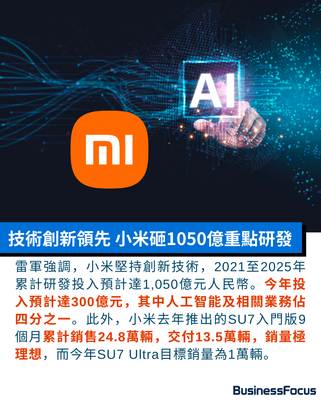 董事長雷軍在發布會強調,小米堅持創新技術,故2021至2025年的累計研發投入料達到1,050億元人民幣。他指今年預計會投入300億元,其中人工智能及相關業務佔四分一。