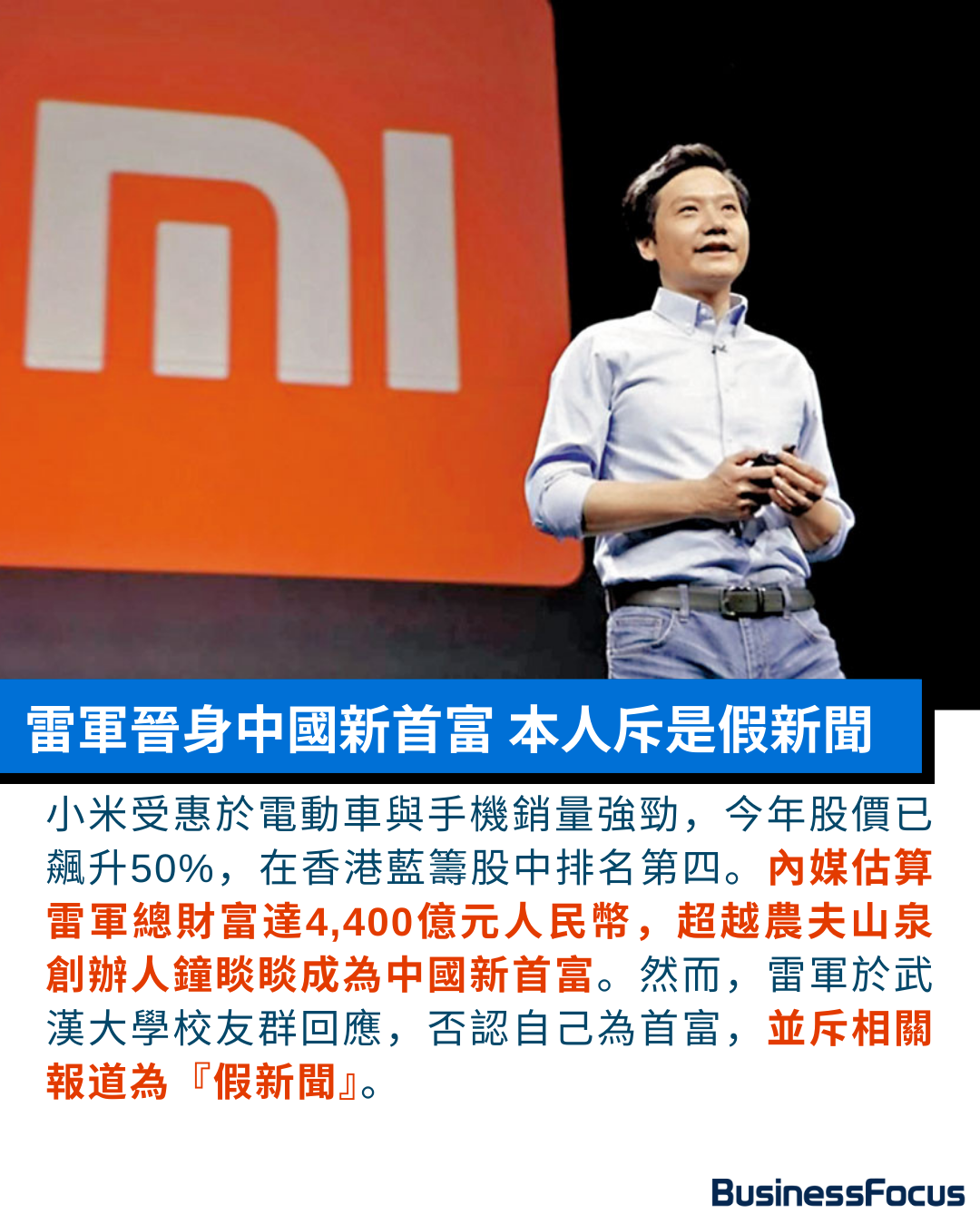 值得留意的是,受惠於電動車及手機銷量良好,小米今年股價已大漲5成,在香港藍籌股中排第4。日前有內媒估算結合米、金山系及順為資本的持股及投資,雷軍總財富估計達4,400億元人民幣,超越農夫山泉(9633)創辦人鍾睒睒晉身成為中國新首富。惟有報道指雷軍於武漢大學校友群回應時否認自己是中國首富,並斥相關報道為「假新聞」。