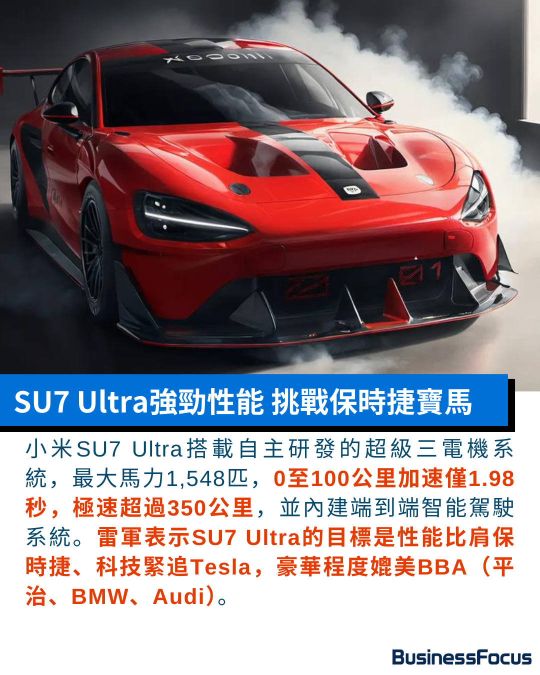 SU7 Ultra受歡迎,與其強大性能有關。小米稱改新車搭載小米自主研發的超級三電機系統,最大馬力1,548匹,0至100公里時速加速最快只需1.98秒,最高時速超過350公里。SU7 Ultra出廠時並已搭載端到端全場景智能駕駛系統、小米澎湃智能座艙。據報智能駕駛總算力達到11.45EFLOPS。