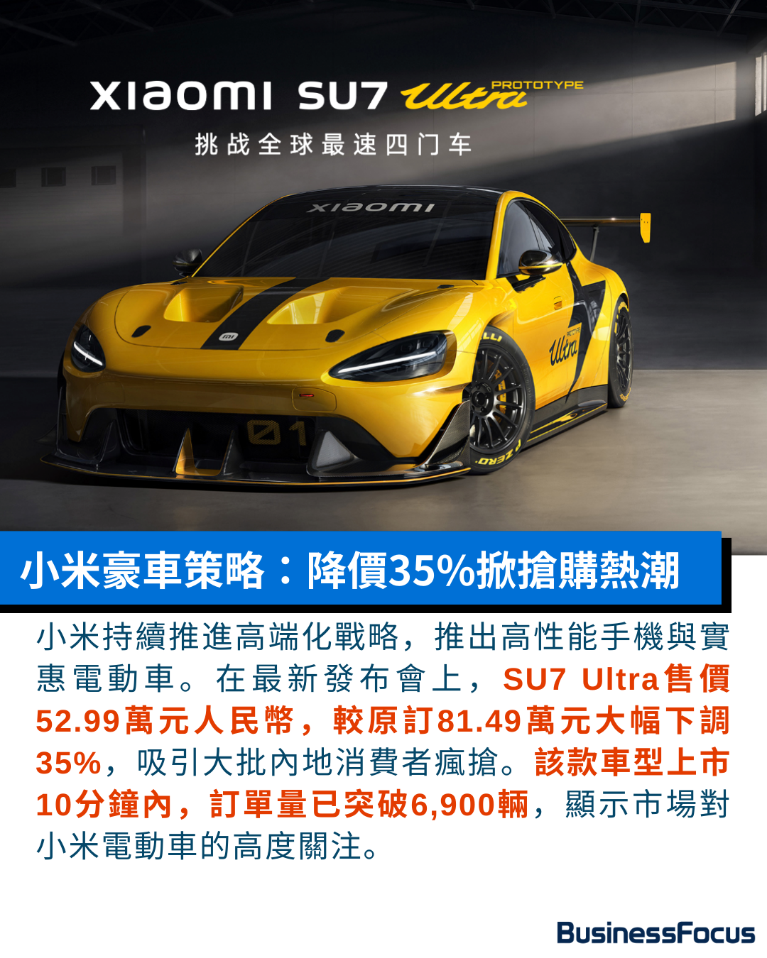 小米過去持續推進高端化戰略,推出高性能手機及實惠的電動車,遂受到大戶追捧。在昨晚的產品發布會上,被小米定位為「新豪車」的SU7 Ultra四門房車索價52.99萬元人民幣,較去年底小米透露的81.49萬元人民幣售價大幅下調28.5萬元,減幅達35%,遂吸引了大批內地網民搶購。據悉,該款跑車上市10分鐘,訂購量已突破6,900輛;