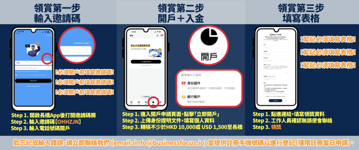 -要享BusinessFocus獨家獎賞,必須於申請賬戶前綁定邀請碼 OHHZJN ,然後填寫表格(https://bit.ly/4h2DlO8 ) 。下載長橋證券手機APP後,或於此:https://bit.ly/3DxbNCI,以手機號碼註冊長橋證券帳戶: