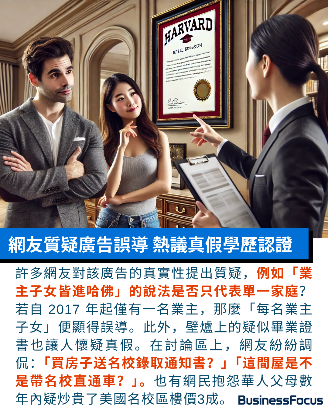 在社交媒體X上,網友對此展開激烈討論。一位用戶寫道:「這種廣告完全是為『虎爸虎媽』量身定做,但孩子真的想讀哈佛嗎?還是只是父母的夢想?」另一位網友則批評:「風水和名校成了賣樓的噱頭,但孩子的快樂和興趣呢?這種文化只會讓下一代壓力倍增。」。