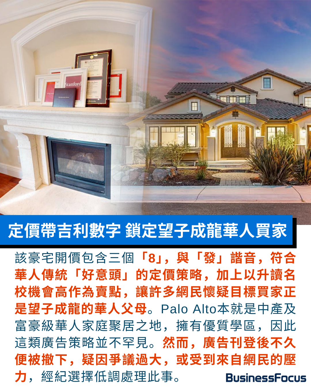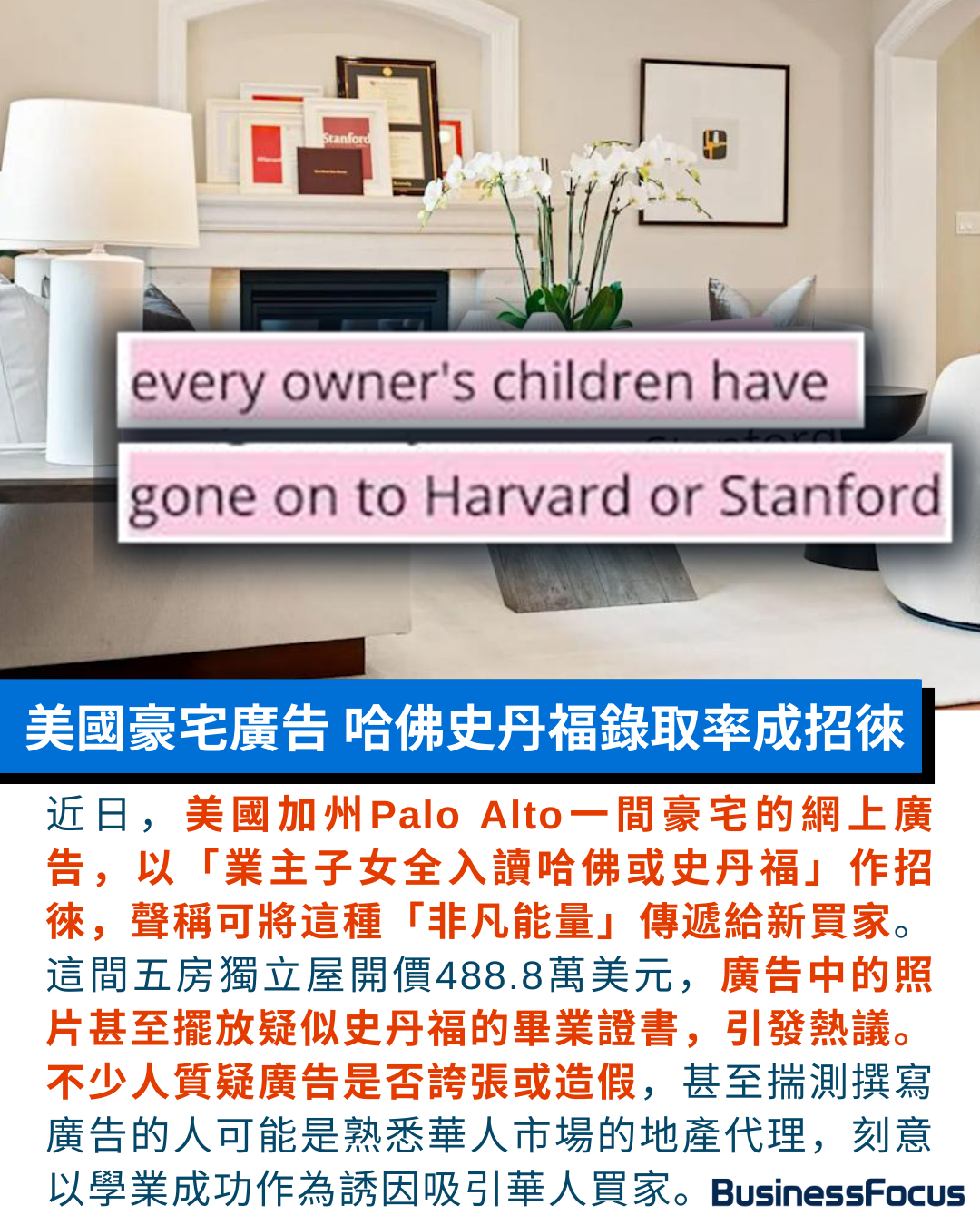 「窮人恩物」、「業主求死」……,香港獨有的誇張地產文學推銷法,疑似殺入美國!近日美國加州Palo Alto一個豪宅網上賣樓廣告,以「業主每名子女都成功入讀哈佛或史丹福」作招徠,地產代理聲稱可把非凡能量傳送給新買家,以促銷使用488.8萬美元(約3,813萬)開價的5房豪宅。廣告相片中的客廳壁爐上甚至擺放了看似是史丹福的畢業證書,惹引來議論紛紛,包括質疑廣告內容及相關相片是否誇張或造假。