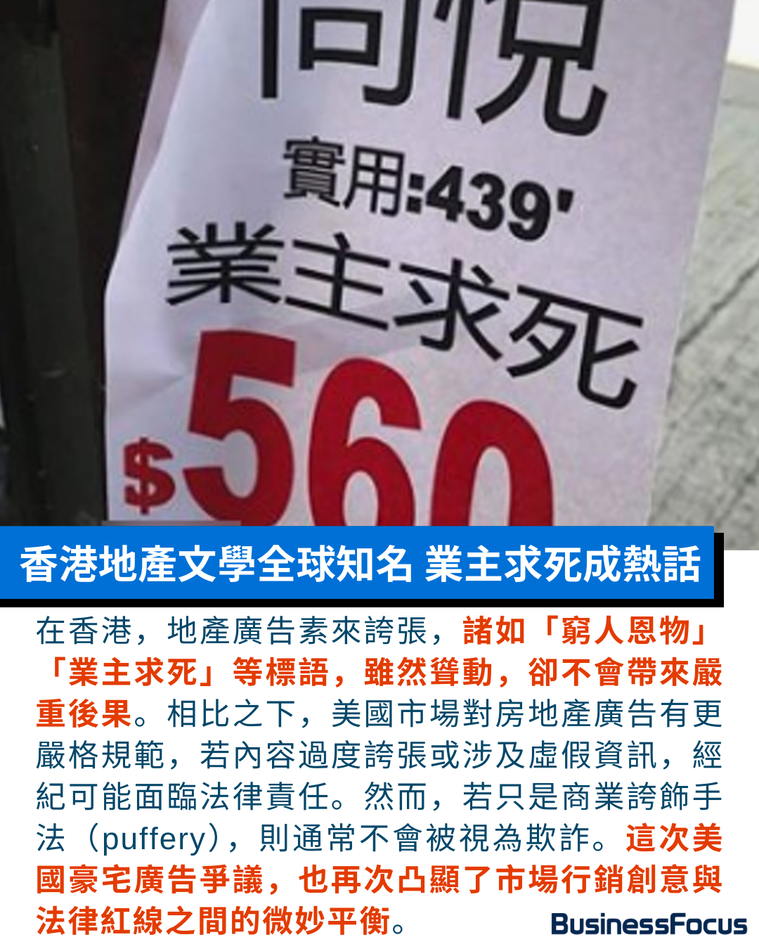 回顧香港,地產文學早已發展出一套獨特的語言體系,誇張、訴諸情感,甚至帶有黑色幽默。例如,「窮人恩物」用來形容價格低廉的小單位,「收租好過打劫」則暗示投資回報可觀,而「跌到極麻木」則用來調侃樓價下跌的無奈。更極端的例子如「賣樓葬父」或「業主求死」,則將地產交易與人生悲劇掛鉤,令人啼笑皆非。