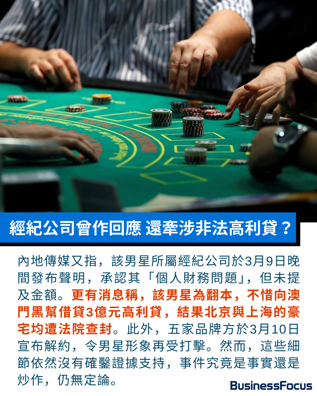 有關傳媒又信誓旦旦表示,該男星的內地經紀公司於3月9日深夜發布聲明承認存在「個人財務問題」但未提及具體金額。又指知情人士透露該明星為翻本甚至向澳門黑幫借貸3億元高利貸,然後報稱北京朝陽區價值2.8億元的獨棟別墅及上海陸家嘴頂級公寓均已被法院查封,涉及的五家品牌方於3月10日上午集體宣布解約。