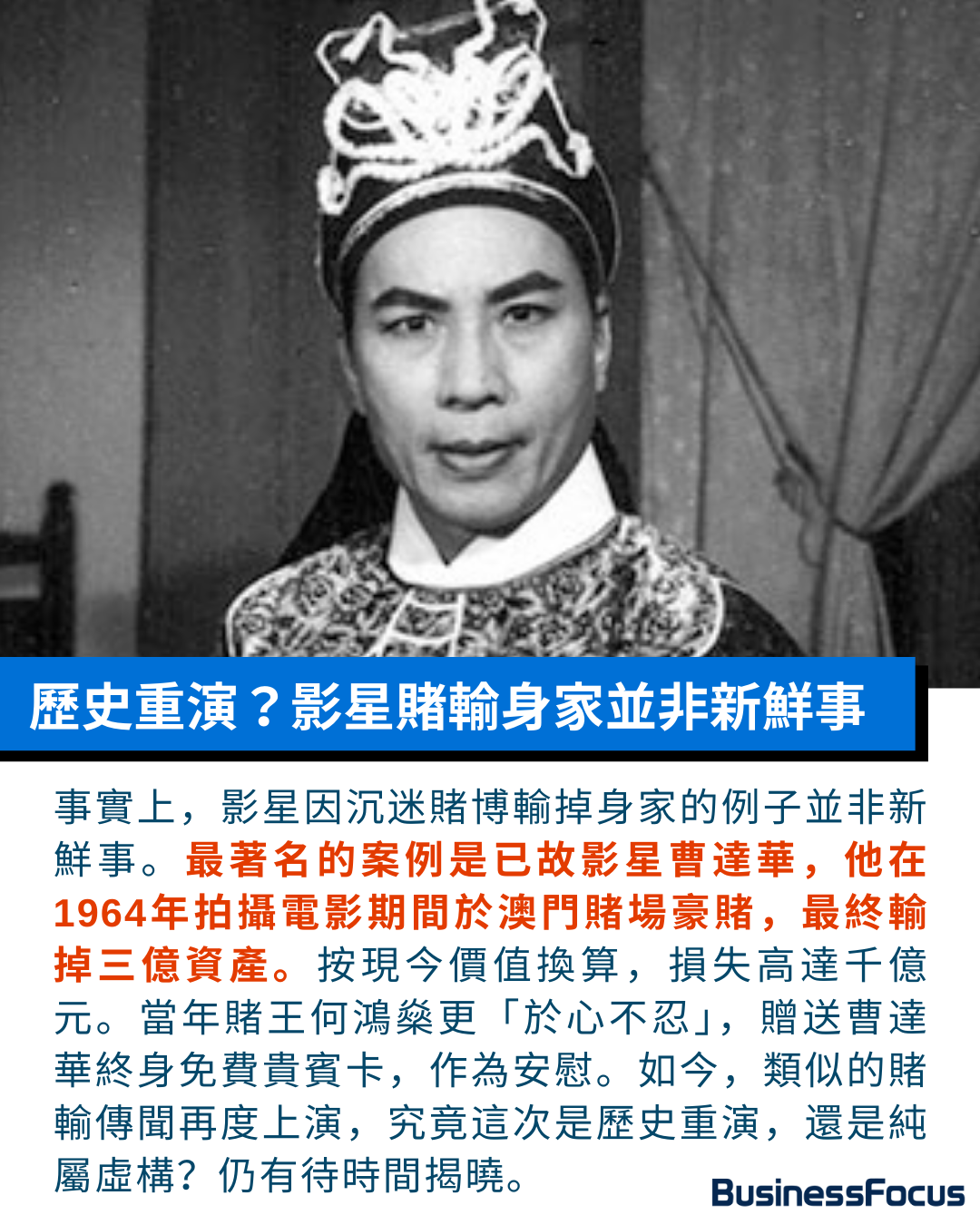 不過影星或其親友在澳門賭場輸身家,其實過去數十年也不斷出現過傳言。其中最真實及驚人的個案,相信是被尊為「華探長」的已故影星曹達華。他在50至60年代曾紅透半邊天,曾擔任多套電影的主角包括探長及武林高手,極受歡迎。傳聞他當年坐擁半條街的物業。可惜他極為好賭,結果在1964年他到澳門拍攝《海角驚魂》時沉迷賭博,竟在賭王何鴻燊的賭場輸了3億身家,有人推算這在50年後的今日,這大概等於失去超過1,000億元。有傳賭王當年「於心不忍」,送了曹達華一張賭場終身免費吃喝的賭場貴賓卡,以示安慰。
