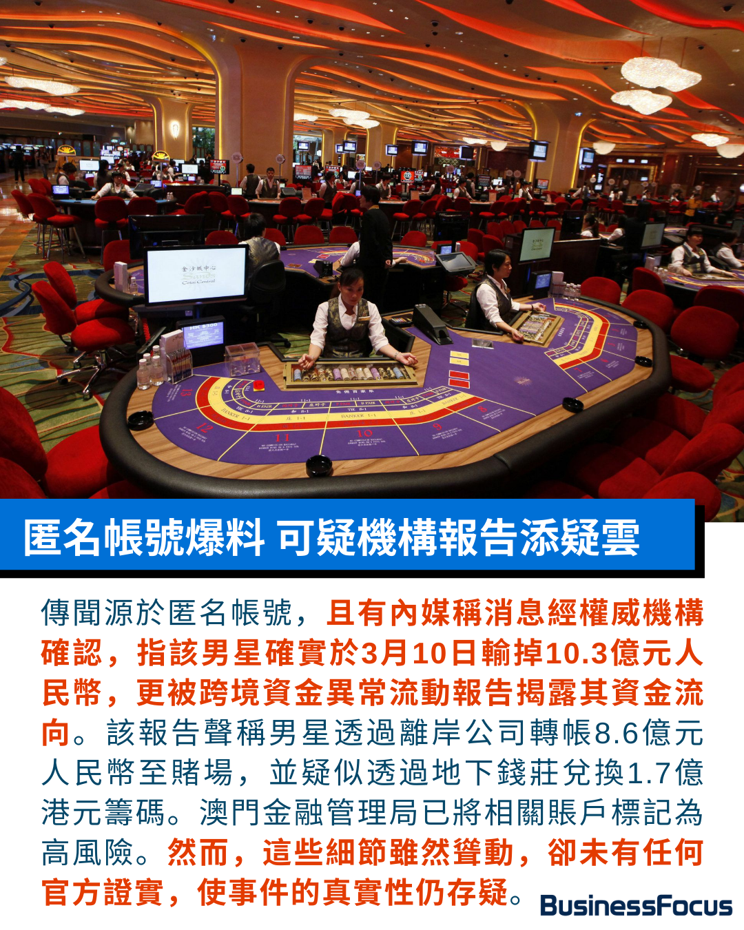綜合微博及內媒的說法,這則熱爆的消息最初來自匿名賬號,故爆料人身分成謎。報道提到,2025年3月10日經權威渠道確認,某超一線男星在澳門永利皇宮賭場貴賓廳連續7日豪賭,最終輸光全部10.3億元人民幣流動資產並抵押3處豪宅和私人飛機。該事件聲稱由一個國際金融調查機構於3月10日發布的跨境資金異常流動報告首度曝光,報告顯示該明星通過離岸公司向賭場賬戶分17筆累計轉入8.6億元人民幣。並疑通過地下錢莊兌換1.7億港元現金籌碼,澳門金融管理局反洗黑錢系統3月6日已將該賬戶標記為高風險賬戶。