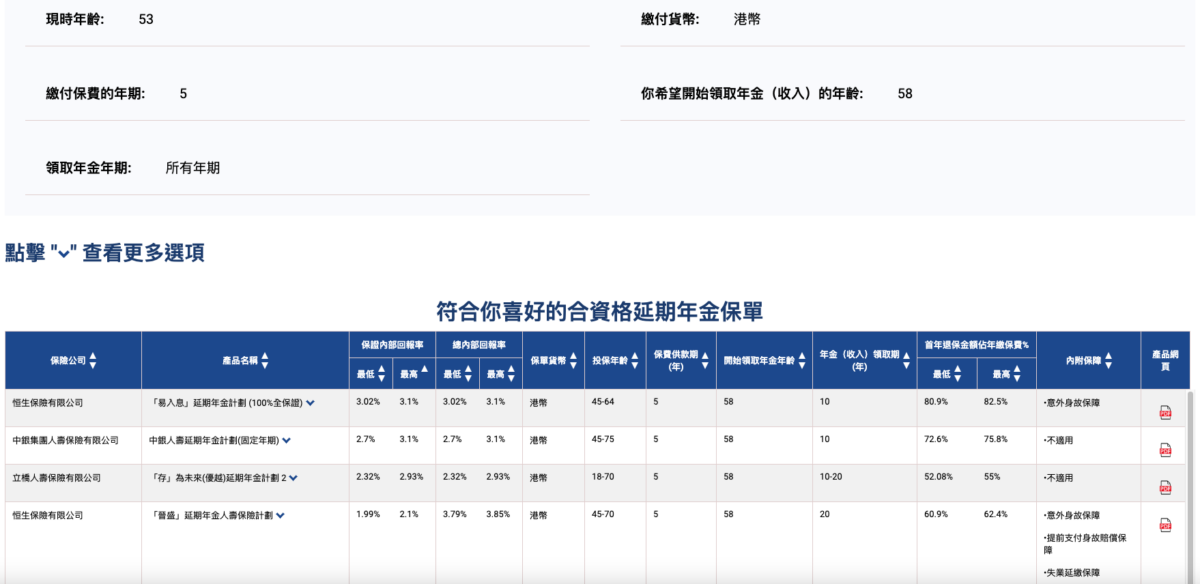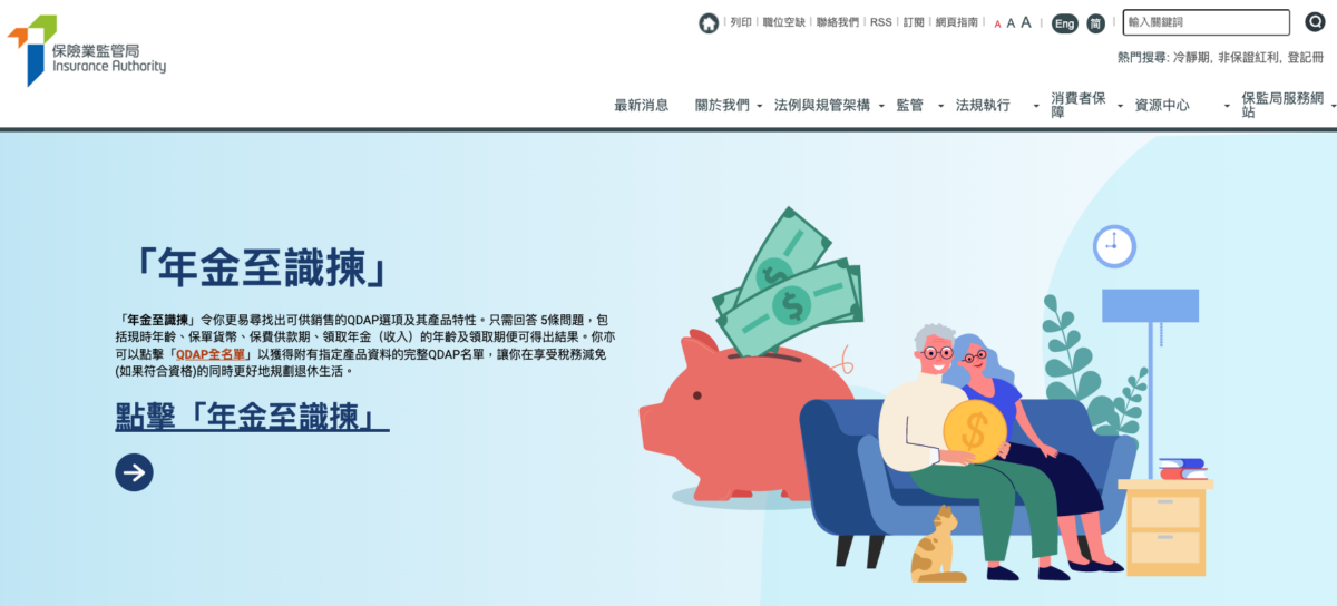 讀者只要在「年金至識揀」網頁回答5條問題,包括現時年齡、保單貨幣、保費供款期、領取年金(收入)的年齡及領取期,網站便可助你尋找出可供銷售的合適QDAP(扣稅年金)產品及其特性。