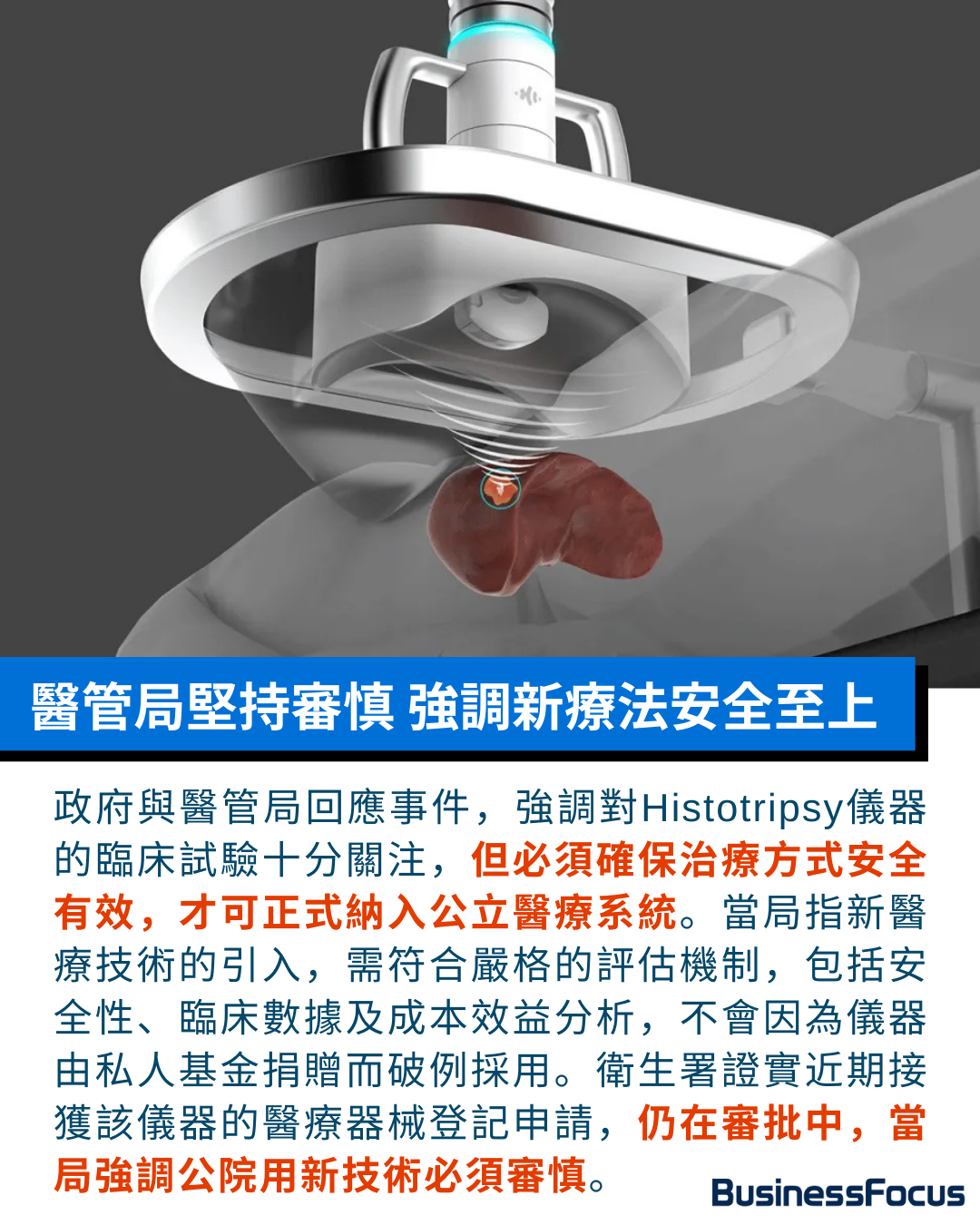 引發爭議的「超聲波組織碎化技術儀器(Histotripsy)」,採用全球頂尖的組織碎化技術,利用高強度超聲波「隔空」瞄準病人體內的細胞以作破壞,過程不用開刀。李嘉誠基金會去年先後向港大、中大醫學院和養和醫院各捐贈一部Histotripsy儀器,並資助兩間醫學院各10位肝癌患者接受治療,事件廣獲市民讚好。
