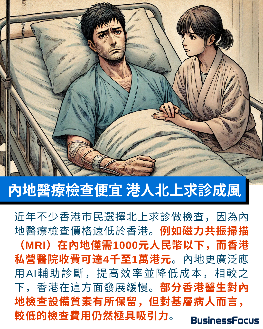 早前已有報道指,若以磁力共振掃描(MRI)檢查為例,本港私營醫療機構收費高達4,000至1萬元,公院相關檢查雖免費,卻往往要排長龍苦候數個月以上,致延誤了治療。反觀內地使用國產儀器做MRI檢查,收費可較香港便宜6至8成,而且早已應用AI協助分析檢查結果,故近年早吸引不少香港病人北上做檢查。不過亦有香港醫生質疑,內地MRI檢查影像解像度較低,質素不及香港。