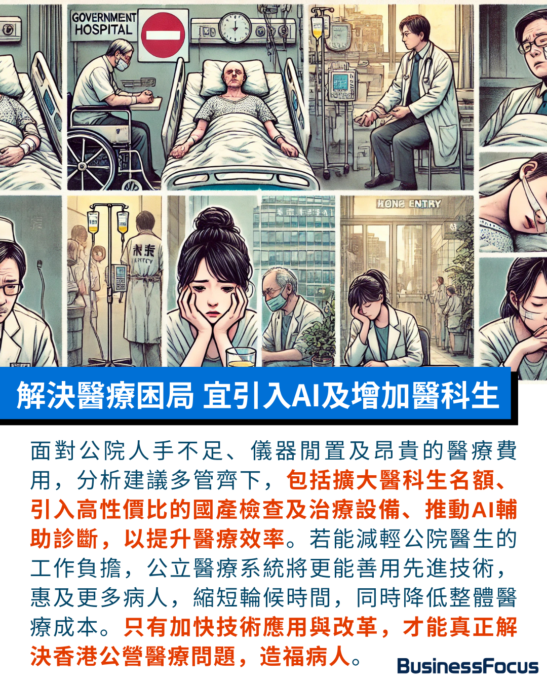 有分析認為,香港若想解決公營醫療的人手不足及其他資源問題,要從多方面入手:包括大幅增加每名醫科畢業生名額、引入價格相宜的先進國產檢查或治療儀器、引入高性價比的內地藥物、以及盡快應用AI協助分析斷症。因為這樣才可以減輕公院醫生沉重的工作量,從而改善醫療質素,以及加快公院新醫療科技的應用。