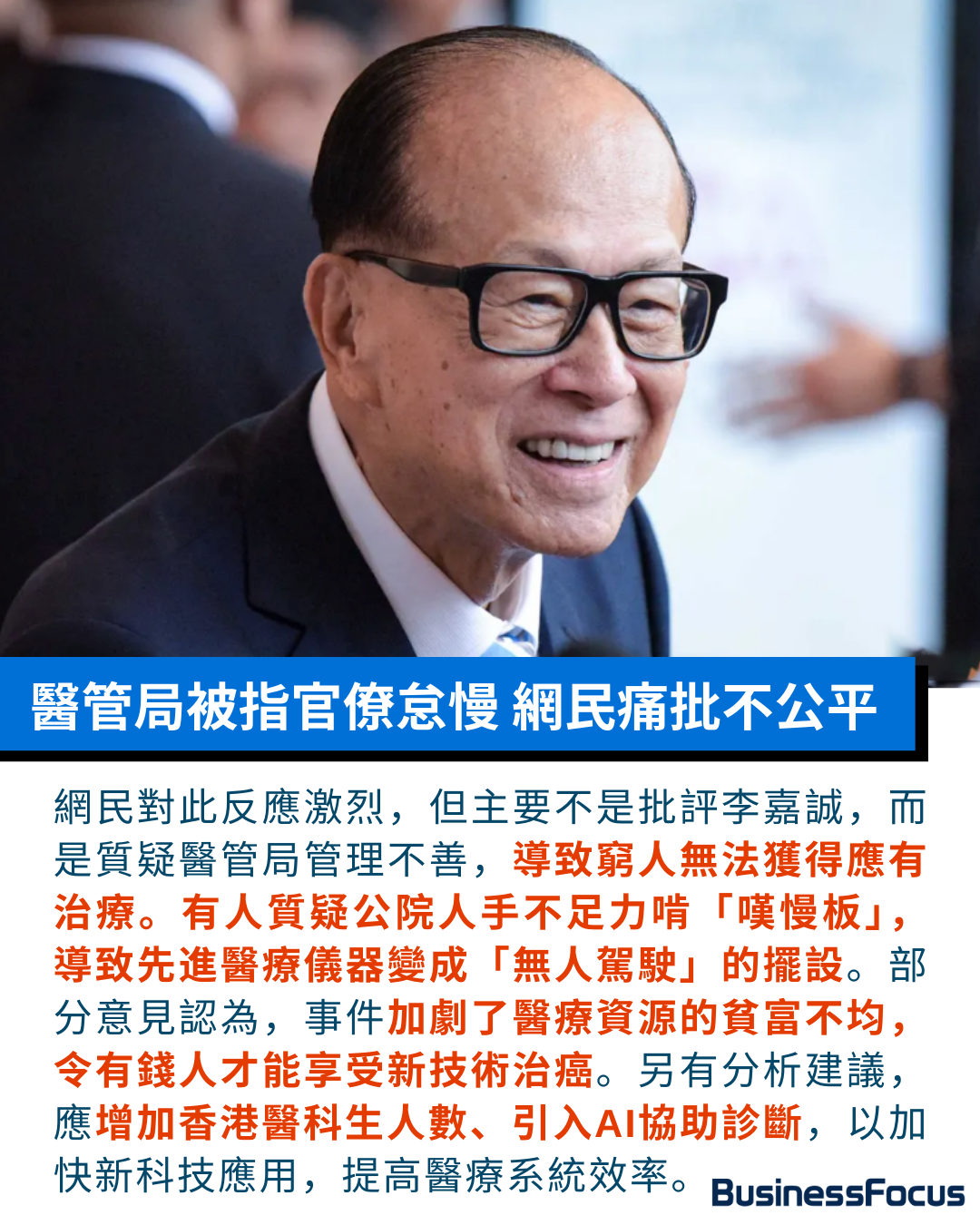 不過網民普遍沒怪責香港首富李嘉誠,矛盾普遍指向醫管局,質疑事件帶出香港公營醫療官僚及「嘆慢板」,加上醫生不足,令先進救命新儀器易變成無人操作的「玩具」。更多的人慨嘆先進治肝癌儀器轉往私家醫院,即是「窮人冇得醫」,加劇了醫療的貧富不公。有分析則認為,要解決問題,需要從增加香港醫科生及引入AI協助斷症等入手,以騰出人手加快應用救人新科技。