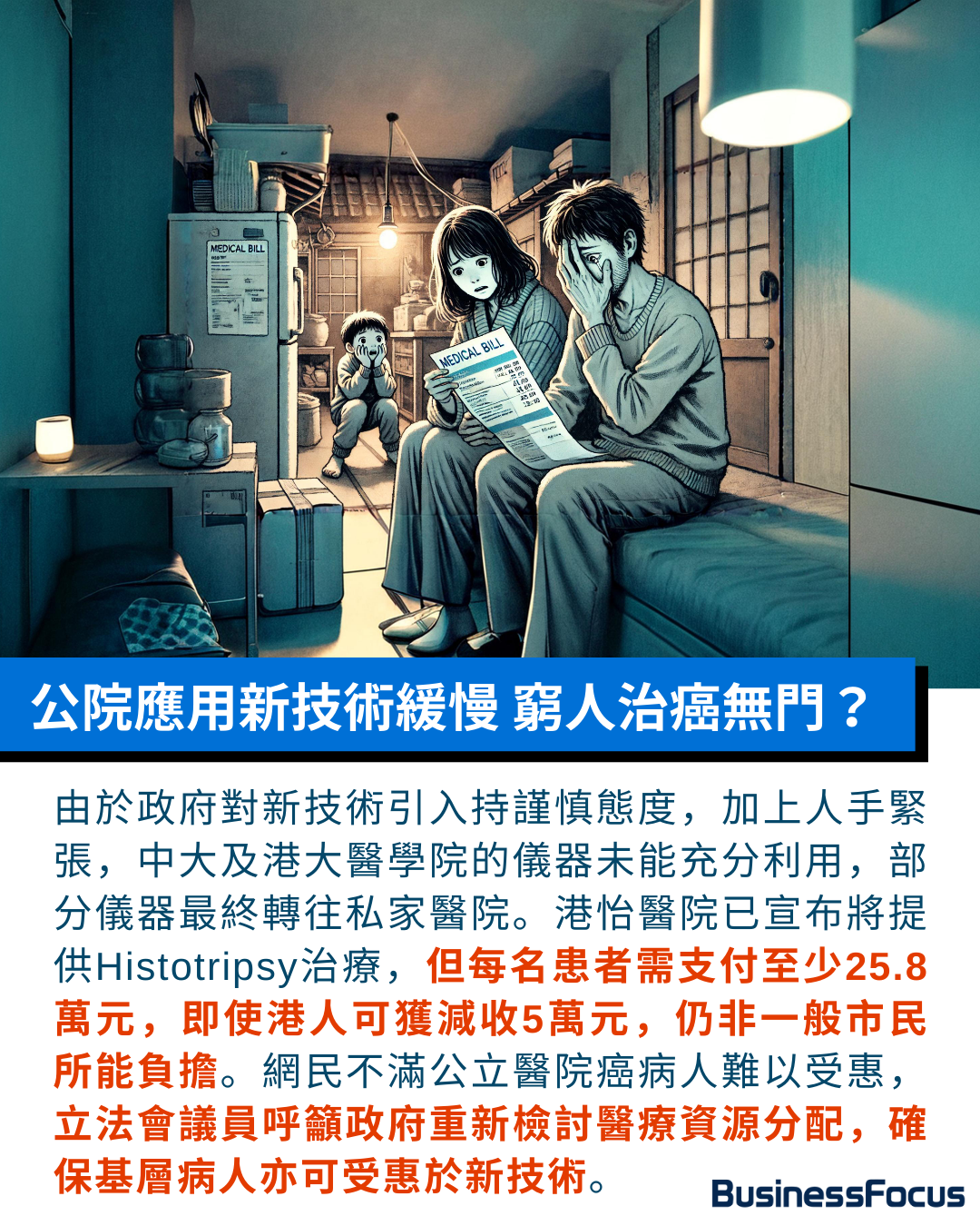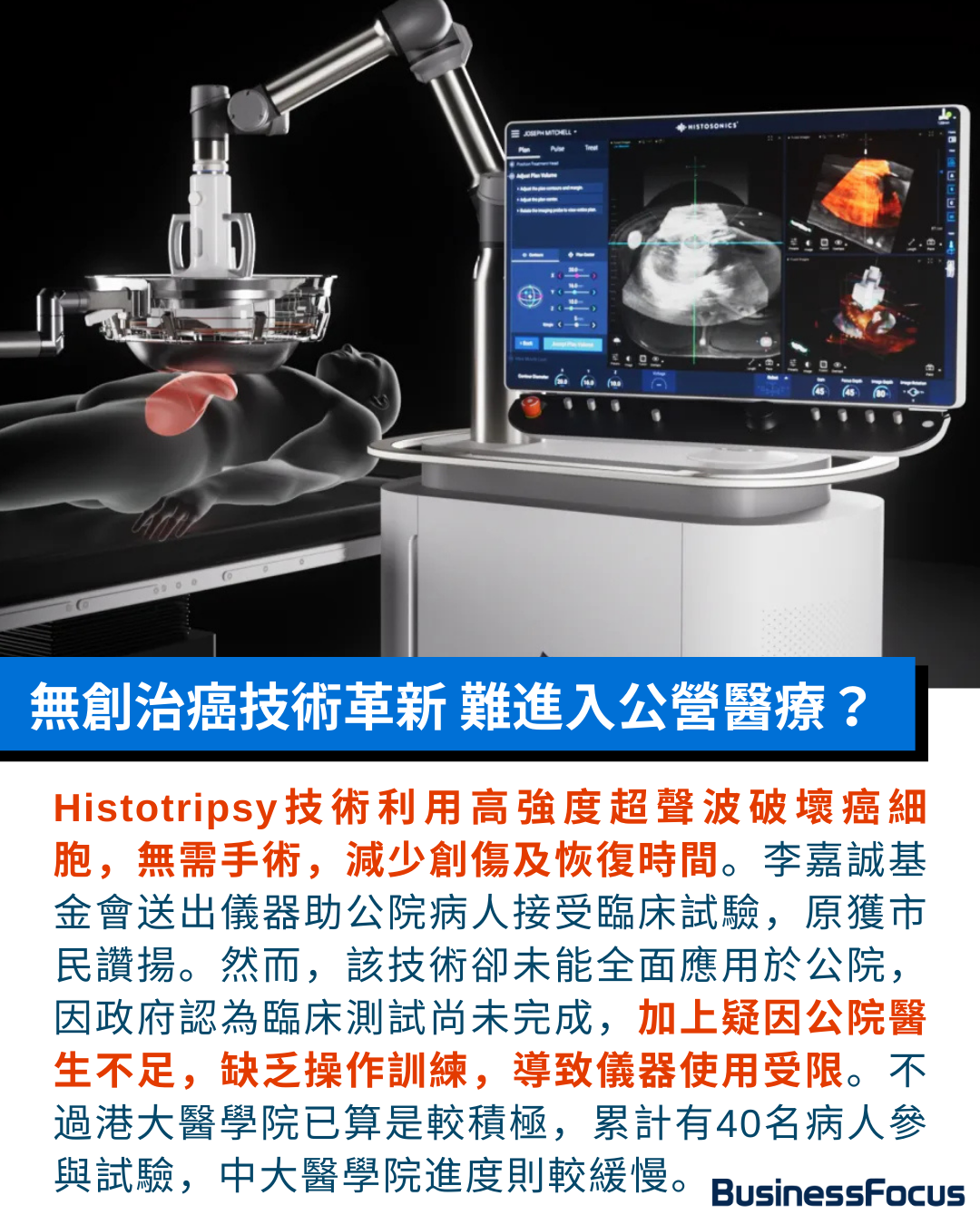 可救命的先進治癌儀器,竟遭醫管局冷待?李嘉誠基金會去年捐贈3部採用「超聲波組織碎化技術(Histotripsy)」的先進治癌儀器,送給港大醫學院、中大醫學院及養和醫院,旨在為肝癌患者提供無創治療。然而事隔多個月,傳出醫管局疑因人手不足及未完成全面臨床測試等因素,竟把先進儀器「投閒置散」,導致一場風波。有消息指為免浪費救人的機會,李嘉誠基金會一方已決定把港大及中大的治癌儀器將轉移至屬私家醫院的港怡醫院及中大醫院。但由於私院治療收費達25至30萬元,變相令公院的窮病人無緣接受先進治療,引起網上熱議。