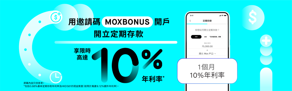 讀者若嫌「搶快閃優惠」太麻煩,也可考慮使用「不用搶」的Mox銀行的高息開戶優惠。Mox早前公布,只需在3月31日前用邀請碼「MOXBONUS」開戶,並於開戶起計7天內開立7.5萬元的1個月港元定存,便可享受10厘高息。新客戶若存款1個月,即可享超過630元利息。但要留意其中581元是以現金獎賞的方式提供,會在6月底之前存入客戶的Mox戶口。