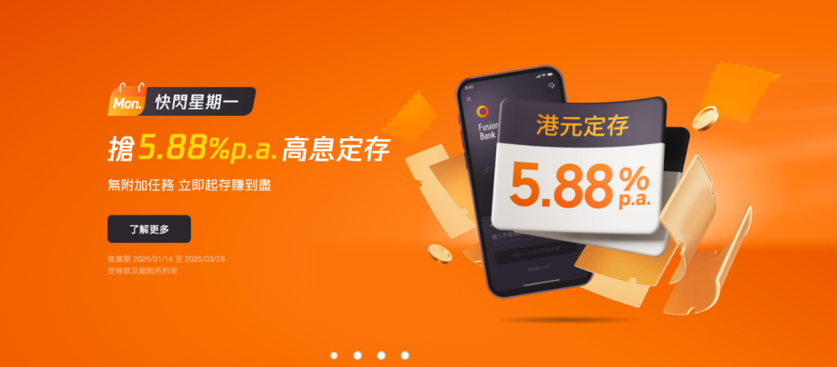 故富融銀行新客戶總共可享受到高達3.9厘的定期存款息率(以20萬港元計算),屬現時市場上最高的迎新優惠之一。富融銀行另為新客戶提供2.3厘息的活期存款利息,詳情可參考富融銀行網頁(網址:https://www.fusionbank.com/common/detail.html?key=fusion2025&lang=tc)。