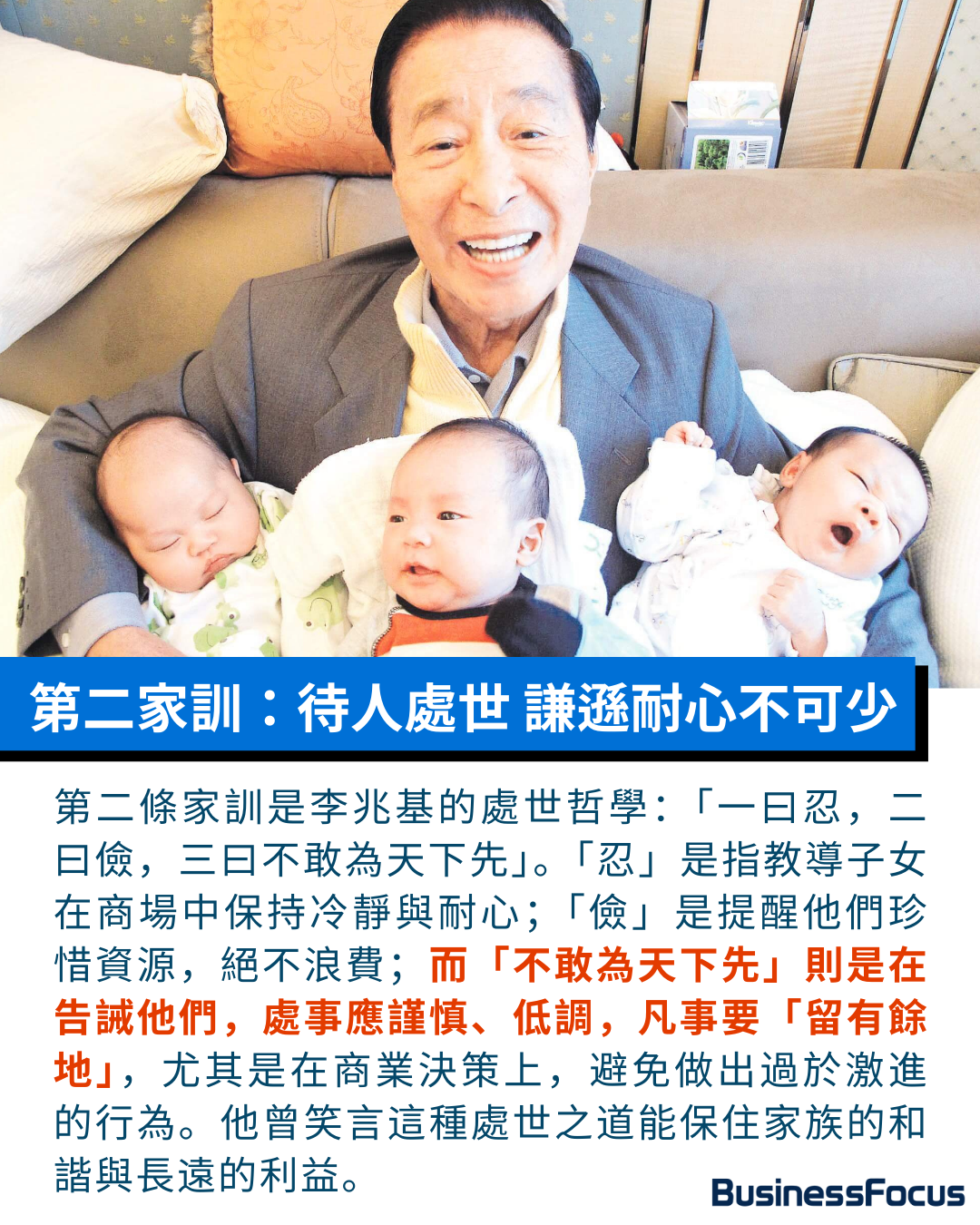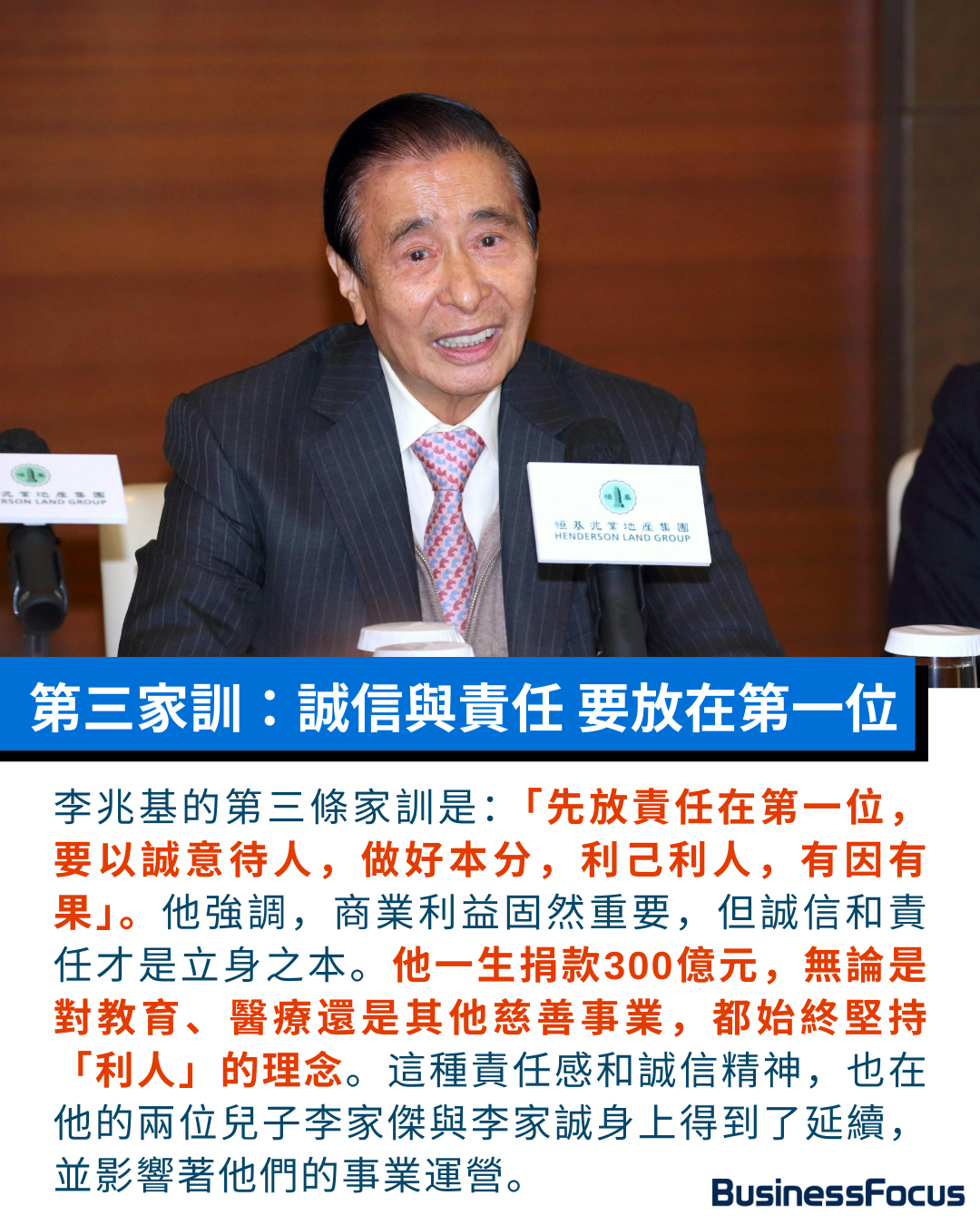 第三個家訓是「先放責任在第一位,要以誠意待人,做好本分,利己利人,有因有果。」因四叔認為,商業利益固然重要,但責任與誠信才是立身之本。他以身作則,一生捐款多達300億,從教育到醫療,無不體現「利人」的信念,從未計較回報。這份責任感,也在李家傑與李家誠身上得以延續。
