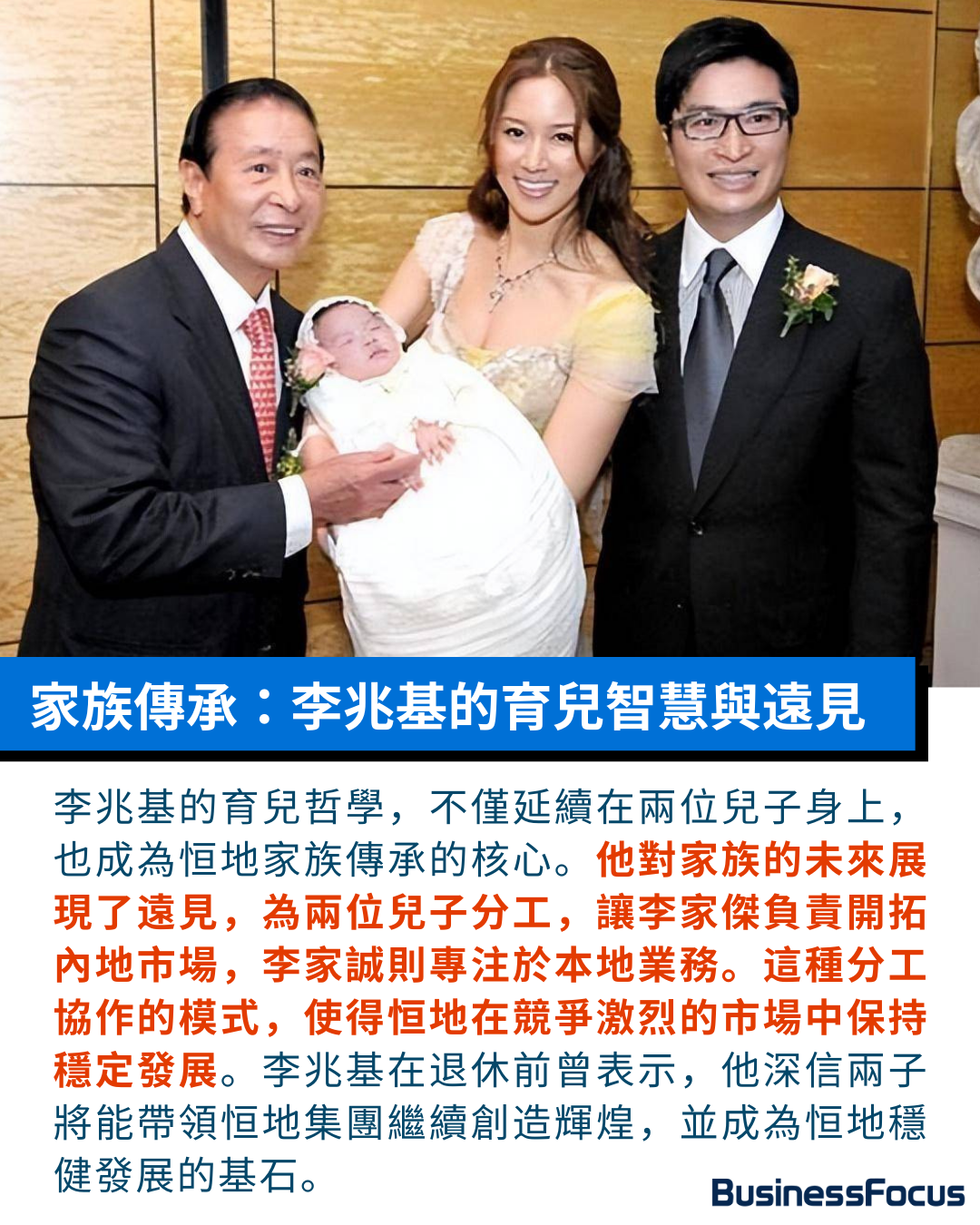 有「香港巴菲特」之稱的四叔曾說:「看着兒子娶媳婦,比自己炒股賺500億還開心。」這句話道盡了他對家庭的珍視,家族成員間的親情,也成為保障恒地王國的「銅牆鐵壁」,故近年即使環球及香港經濟再動盪,集團仍能在風雨中屹立如故。如今李兆基雖已仙逝,但在其愛兒即李氏兄弟攜手之下,外界料恒地集團勢必能延續四叔的神話及傳奇。