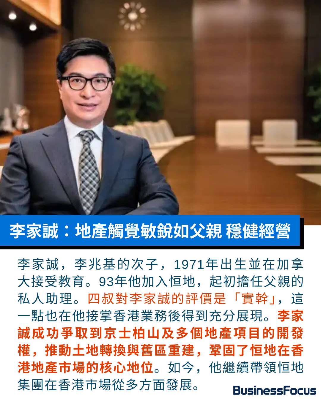 至於李兆基的次子李家誠,1971年出生於香港,在加拿大接受教育後,1993年加入恒地,最初擔任父親的私人助理。四叔稱讚李家誠「實幹」,這份評價在他接掌香港業務後展露無遺。1995年,李家誠初露鋒芒,代父競投京士柏山地皮成功,翌年又接連拿下筲箕灣、大埔等地,屢創佳績,當時已顯現出他具有作為地產大王的父親的市場觸覺。他在老臣子提點下,逐步接手香港地產業務,推動農地轉換與舊區重建,進一步鞏固恒地在本地市場的核心地位。