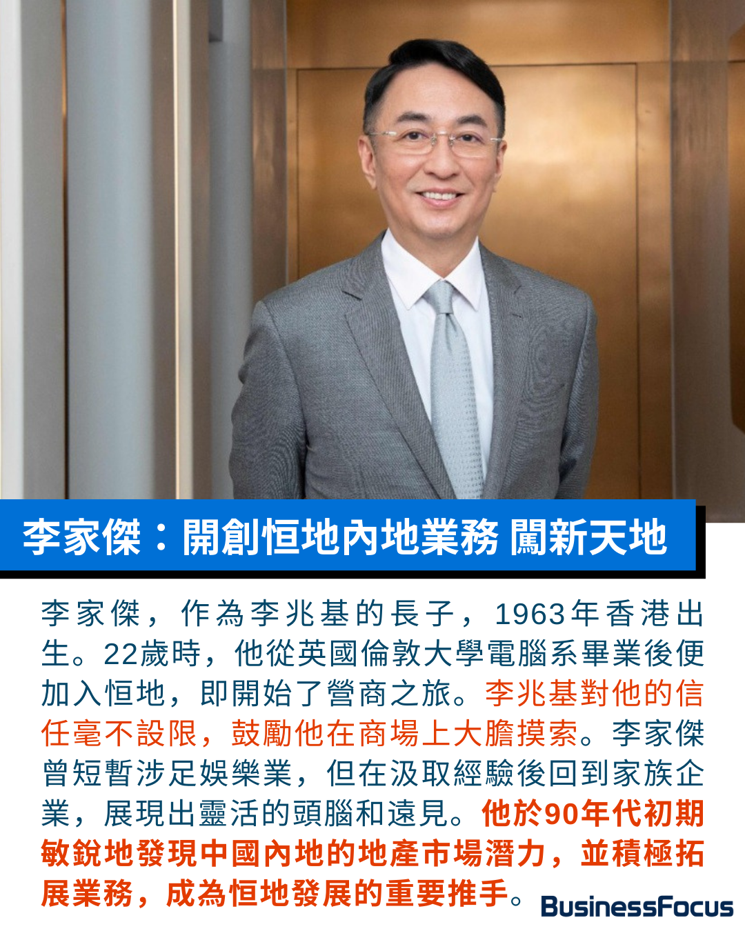 事實上四叔兩名兒子李家傑李家誠,早已分別接棒恒地不同的業務,除獨當一面外,兩兄弟更是合作無間。其中長子李家傑,1963年出生於香港,22歲從英國倫敦大學電腦系畢業後,便加入恒地擔任執行董事。四叔對他的信任,從不設限,放手讓他獨自摸索商場之道。李家傑曾短暫與友人合夥經營娛樂生意,吸取經驗後回歸家族企業,展現出靈活的頭腦與遠見。1990年代初,他敏銳洞察內地地產市場的潛力,主動請纓北上開拓業務。四叔欣然支持,並鼓勵他將視野拓展至香港以外。
