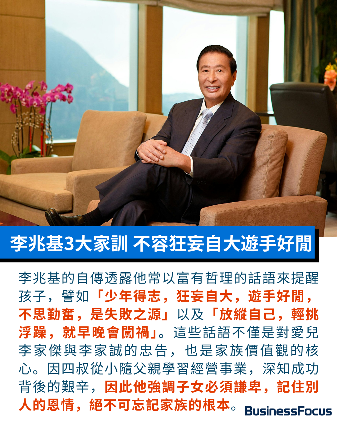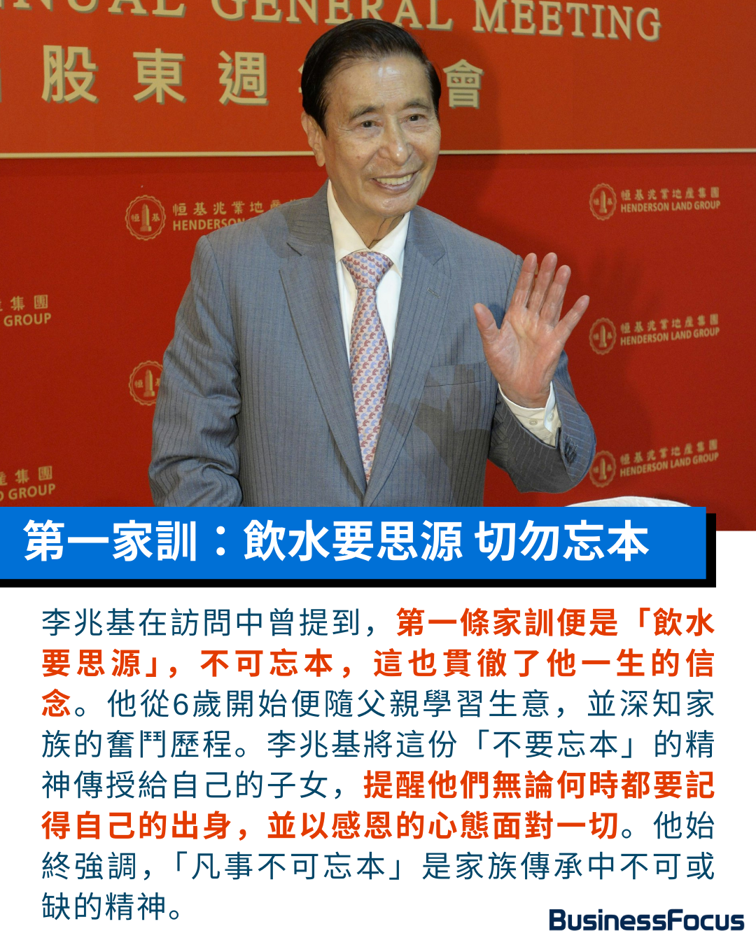 李兆基的自傳中,記錄了他對子女的殷切教誨。他常說:「少年得志,狂妄自大,遊手好閒,不思勤奮,是失敗之源」、「放縱自己,輕挑浮躁,就早晚會闖禍」、「凡事不可忘本。若飲水而不思源,後果堪虞。」這些話不僅是他對愛兒李家傑與李家誠的訓勉,更是家族價值觀的核心。因為四叔自幼隨父李介甫學習經營金肆與銀號,深知成功背後的艱辛,因此他從小便要求子女保持謙卑,要緊記他人的恩情,也絕不能「忘宗」。