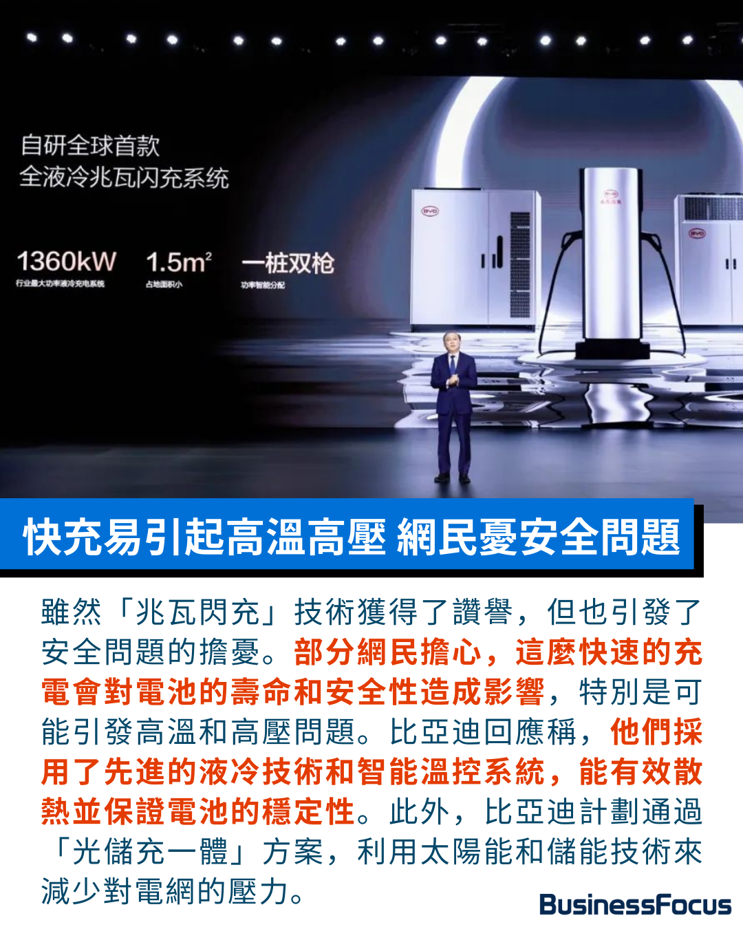 大和證券給予比亞迪「買入」評級,認為「兆瓦閃充」技術將推動其銷量進一步增長,並可能擴展至秦EV和元EV等大眾市場車型。然而,也有分析師提醒,當前股價已反映部分利好因素,短期波動風險不容忽視,建議投資者等待回調後分批建倉。此外,比亞迪雖然聲稱會在全中國建4000個「兆瓦閃充站」,但時間表不詳,超級快充是否真的安全,仍有待觀察。